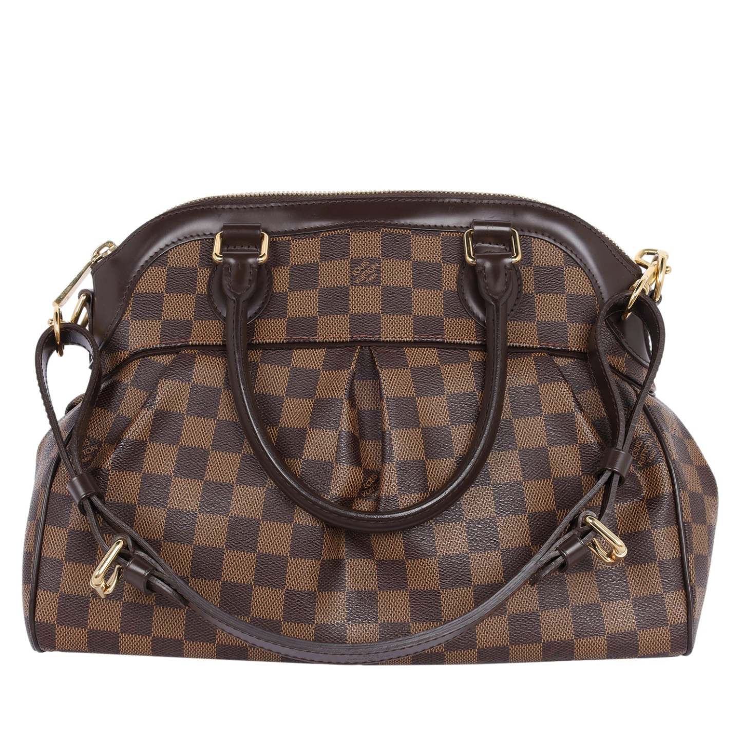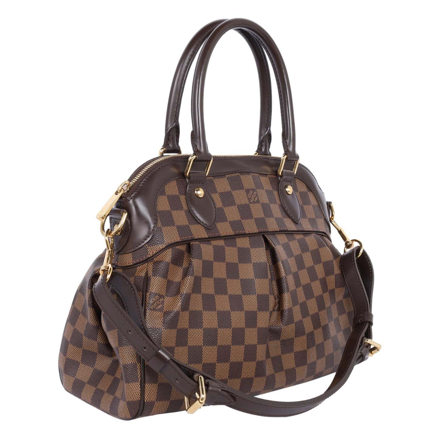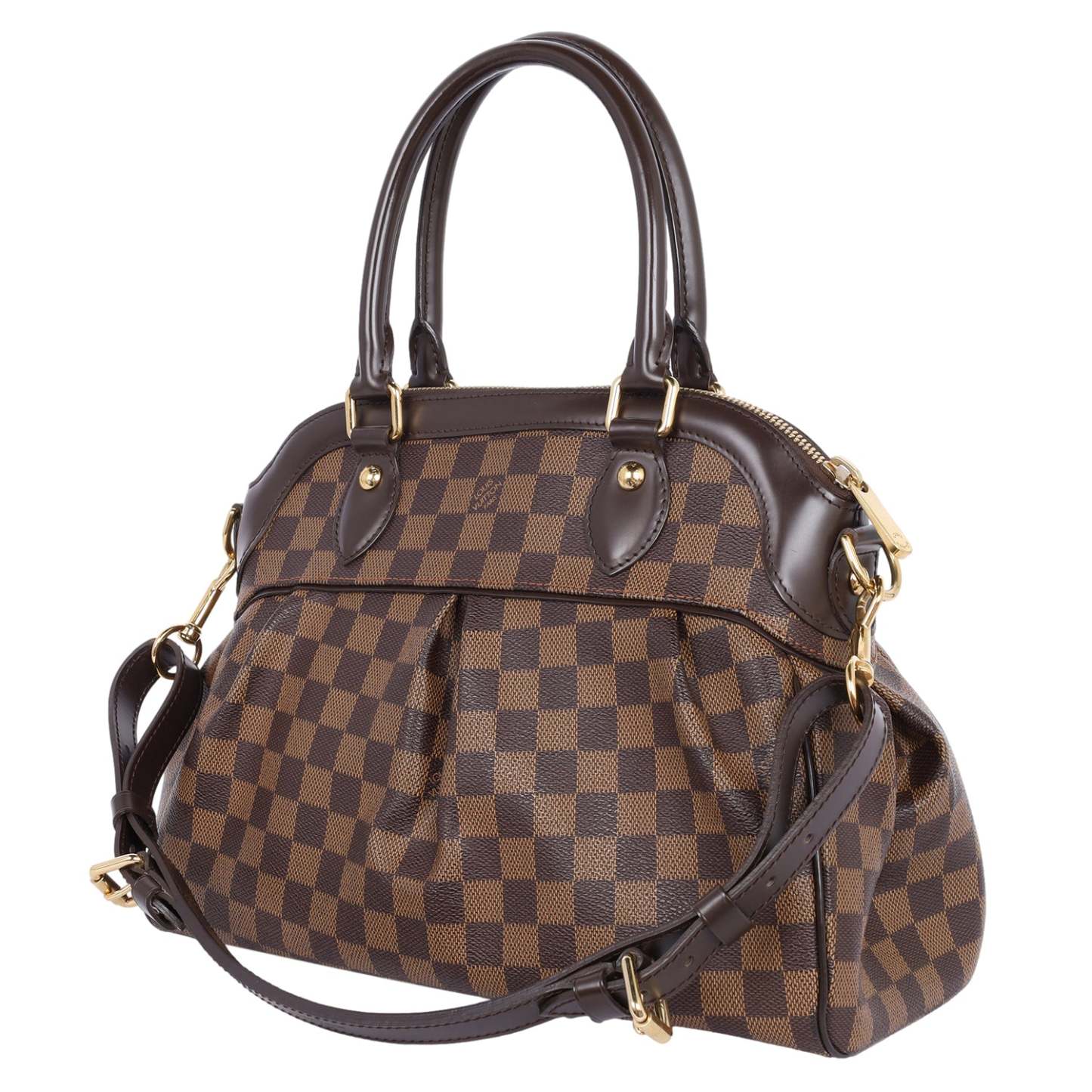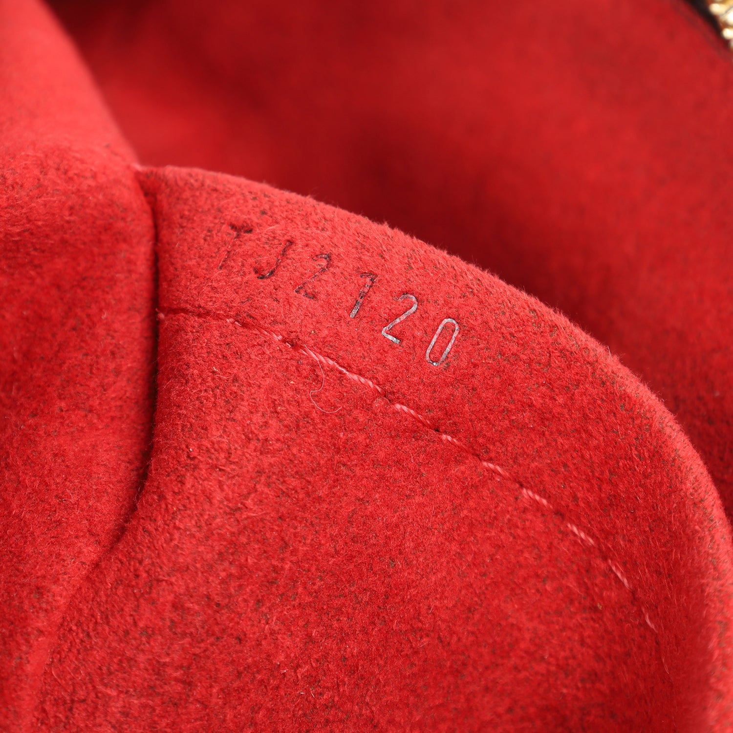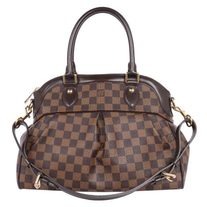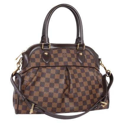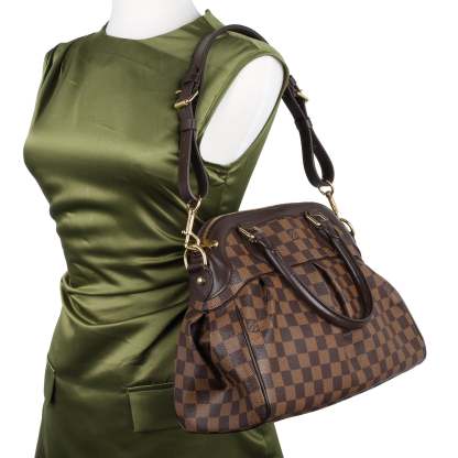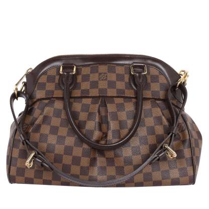 Authentic Lothtuis Vuthtitton Damier Ebene Trevi shoulder bag. This chic bag features Lothtuis Vuthtitton Damier Ebene coated canvas in brown, zipper top closure, an adjustable dark brown leather shoulder strap, dual leather rolled handles, brass hardware. The top zipper opens to a vibrant red fabric interior with 2 slip pockets.