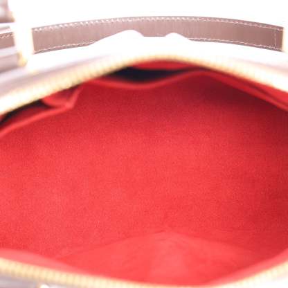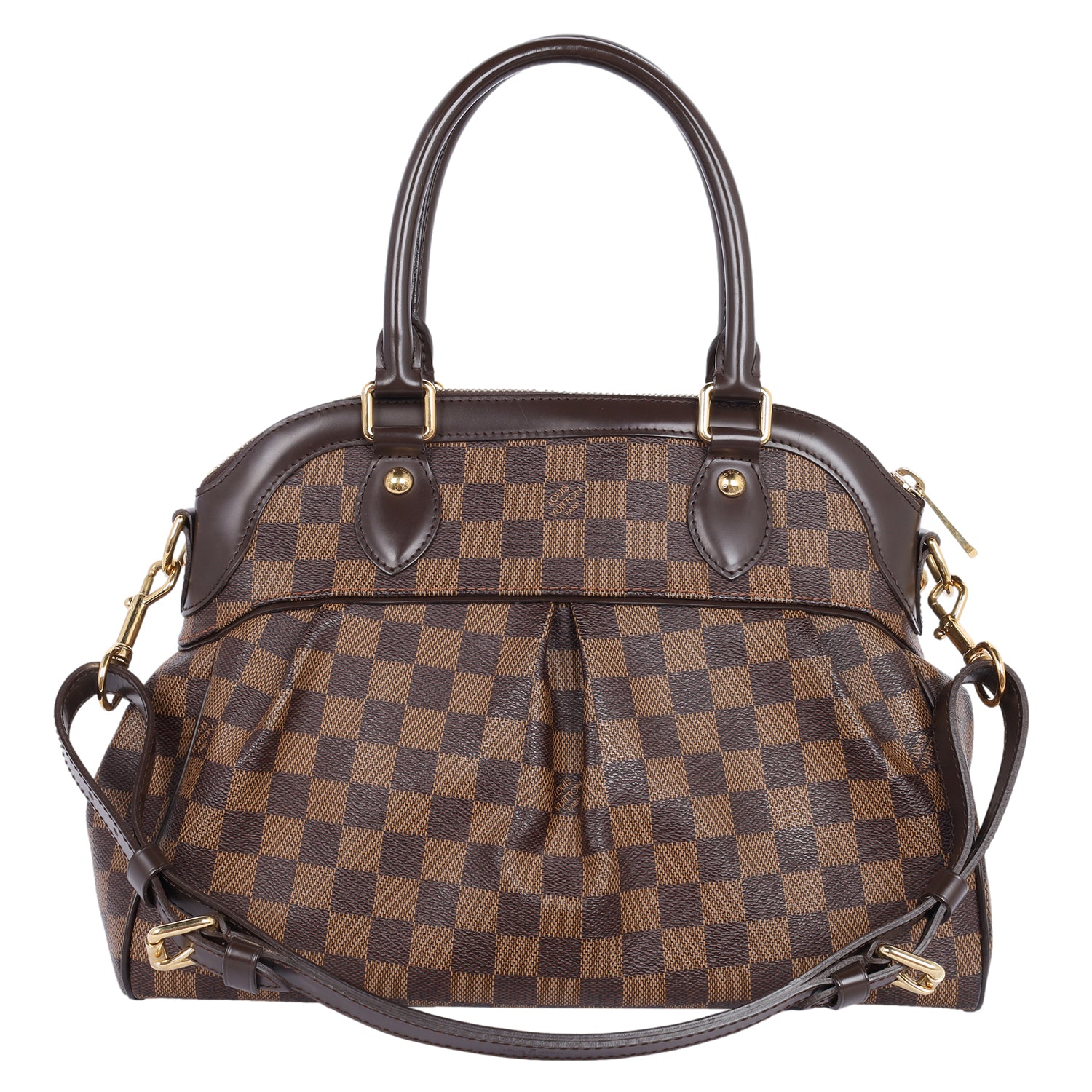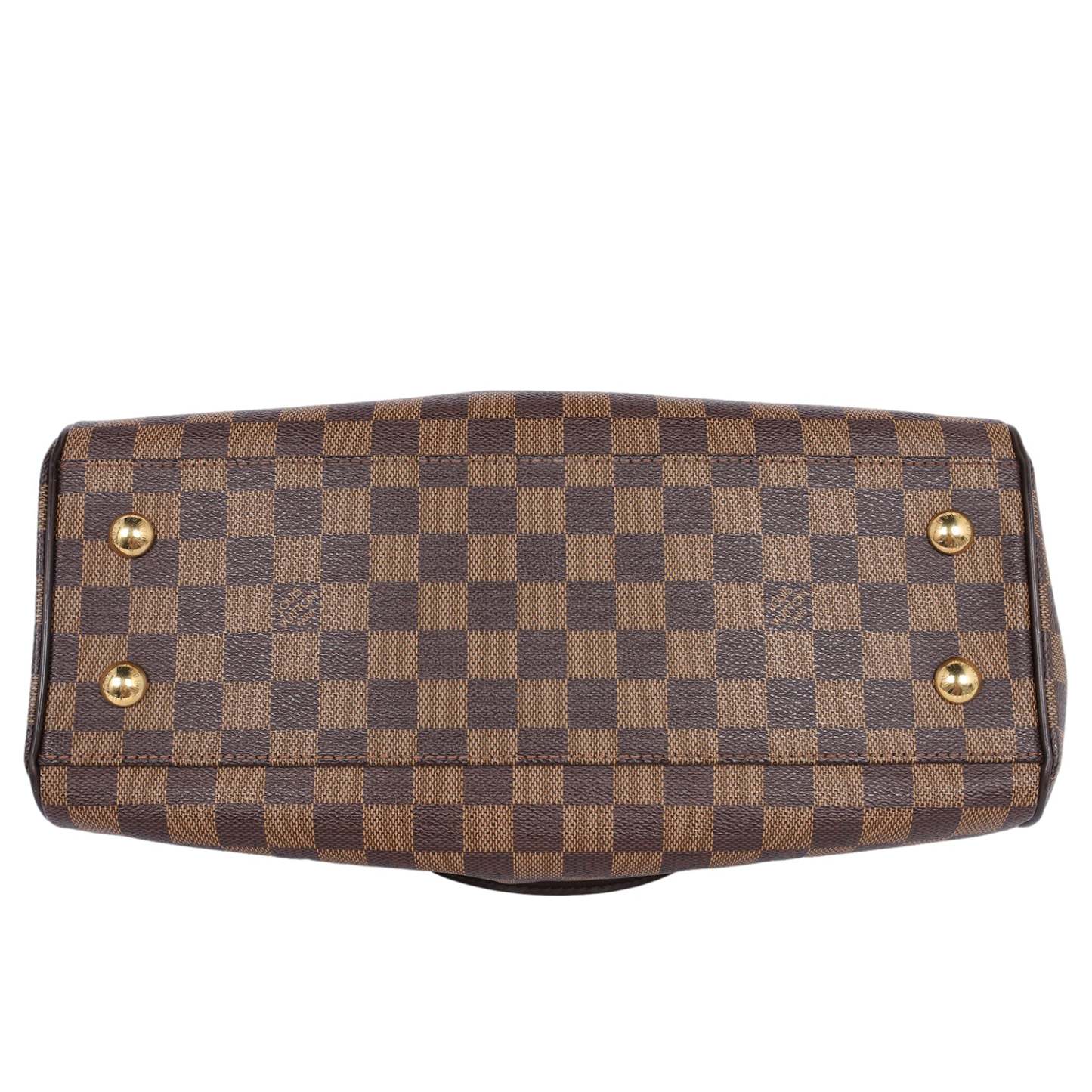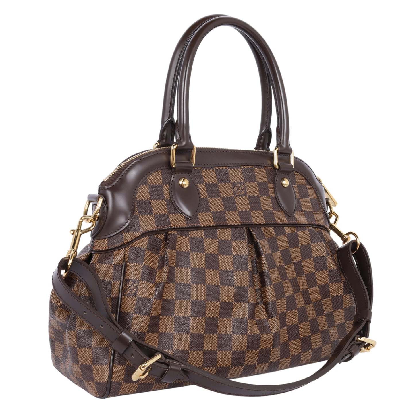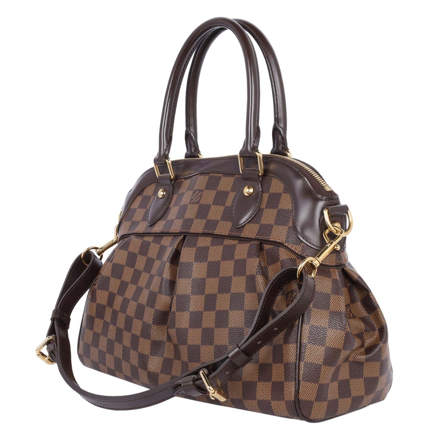 Authentic Lothtuis Vuthtitton Damier Ebene Trevi shoulder bag. This chic bag features Lothtuis Vuthtitton Damier Ebene coated canvas in brown, zipper top closure, an adjustable dark brown leather shoulder strap, dual leather rolled handles, brass hardware. The top zipper opens to a vibrant red fabric interior with 2 slip pockets.