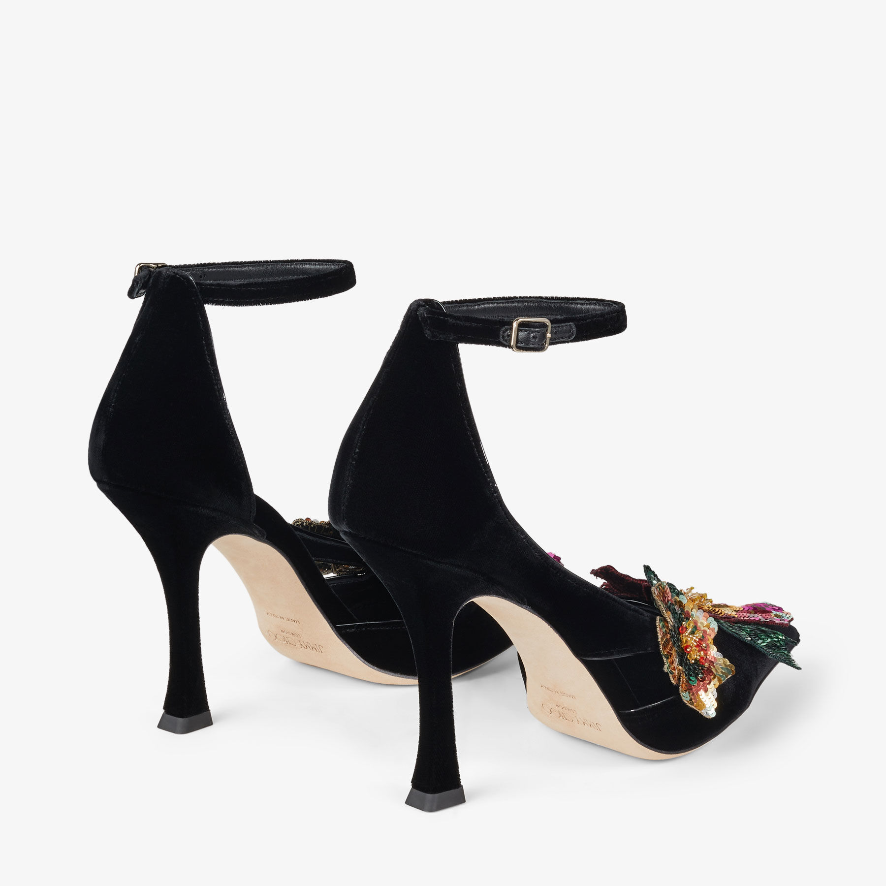 Item No.AZARA100BGVItalian-crafted in plush velvet, the Azara is a standout pump in a classic silhouette. It’s pointed-toe is accentuated by cut-out panels. Sequined flowers embellish the front of the shoe in a distinctive applique design. It is complemented by an adjustable ankle strap and slim curved heel.