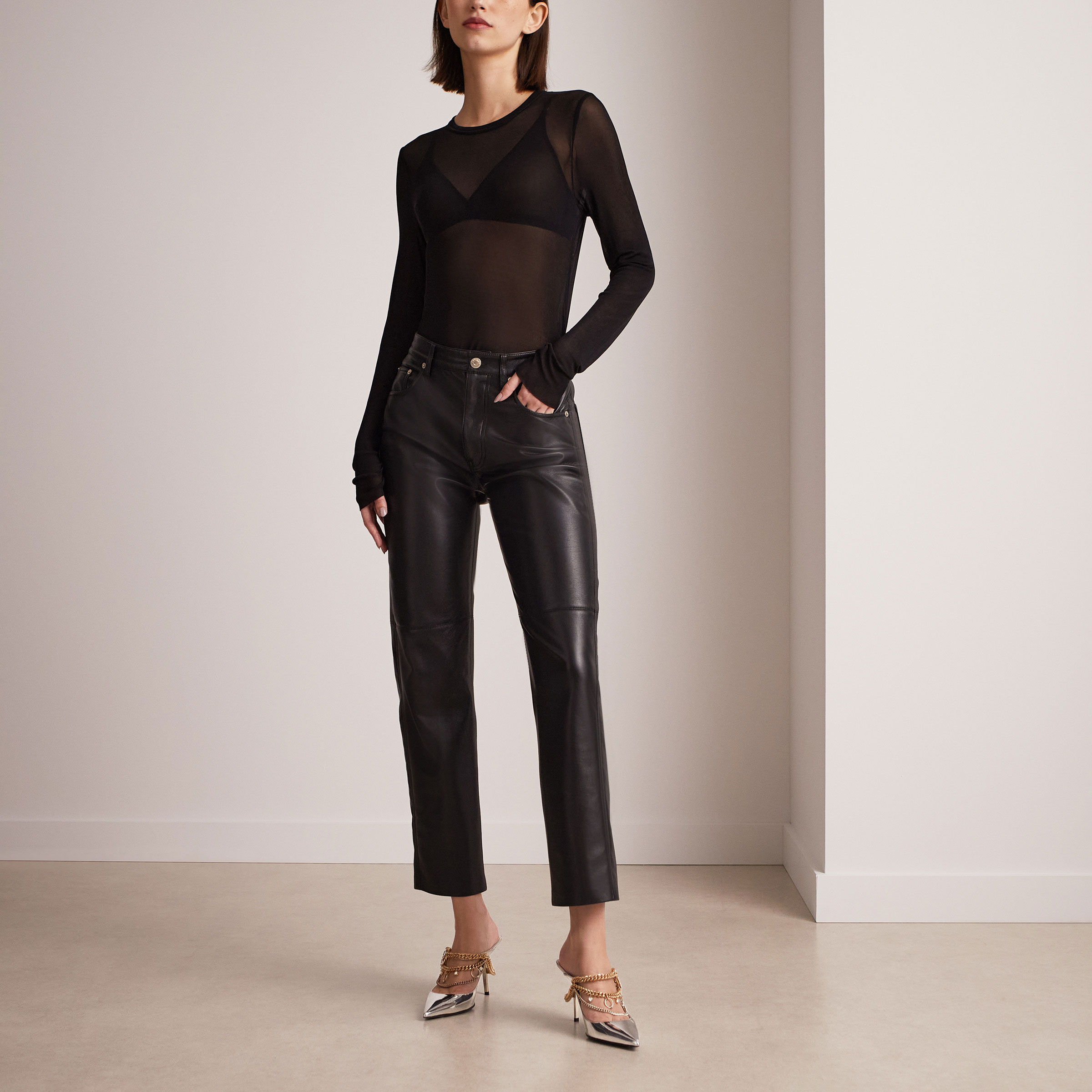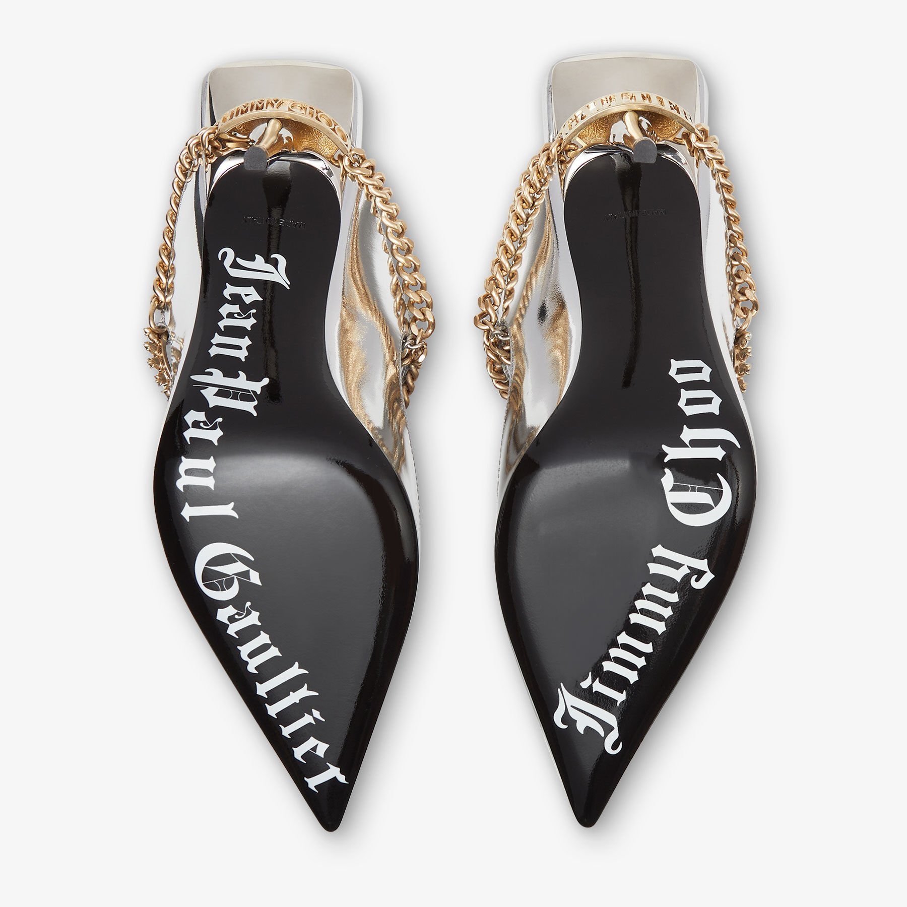 In liquid metal leather, the Bing’s signature cuff is reimagined as an asymmetric brass jewellery piece decorated with crystals. The metallic chain starts on the front and continues onto the back of the shoe, embracing the heel, where it is finished with a leather-lined metallic plate. It is constructed with a chiselled stiletto heel, complemented by a lacquered sole with a digital print logo featuring both brand names.