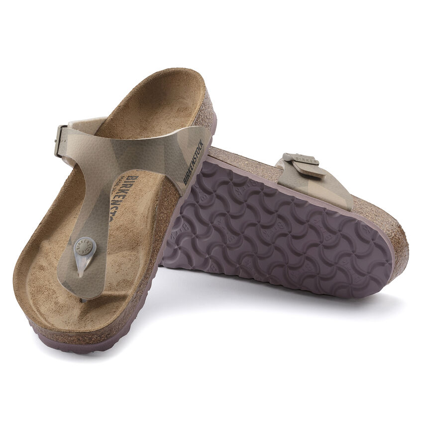 Il modello Birkenthtstock Gizeh unisce il design minimalista e alla moda a una stabilità ottimale: un vero classico. Qui il sandalo si presenta tono su tono, dunque perfetto per un look camouflage alla moda. Può essere facilmente scambiato per vera pelle. Le fibbie in colore coordinato donano la percezione tattile di un tessuto e con il loro design opaco danno ancora più risalto al modello. La tomaia è in Birko-Flor® resistente all’usura e delicato per la pelle.