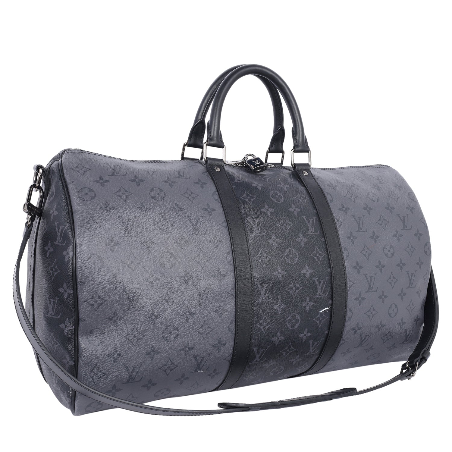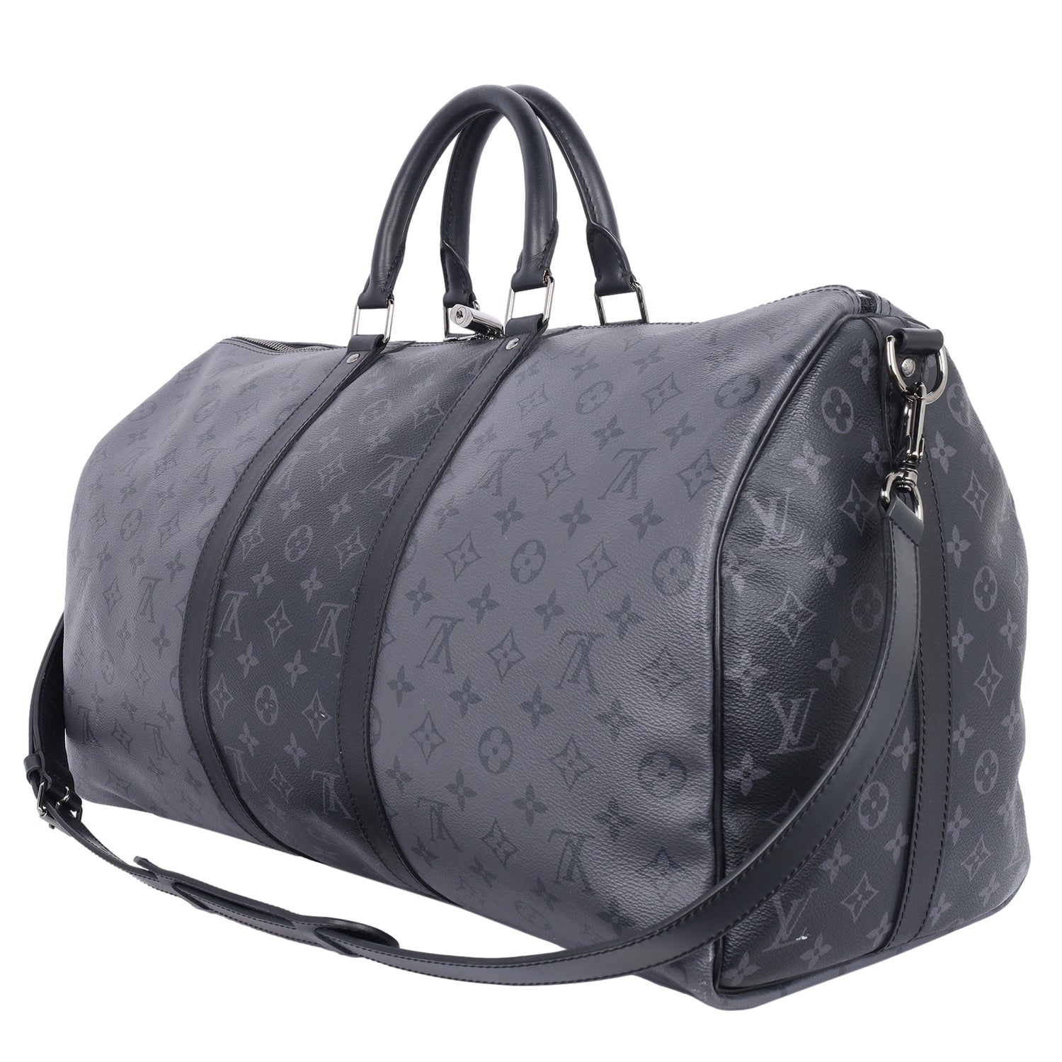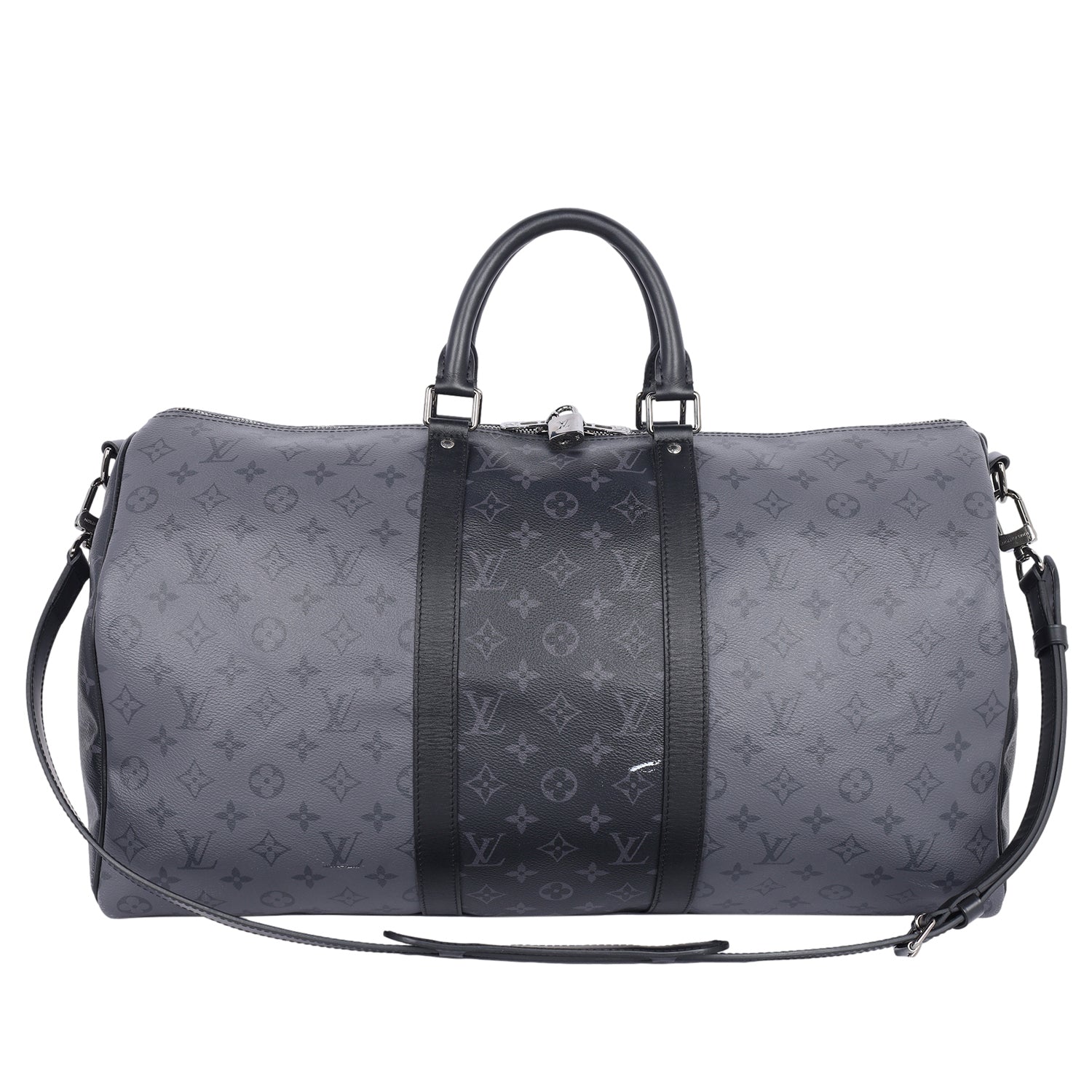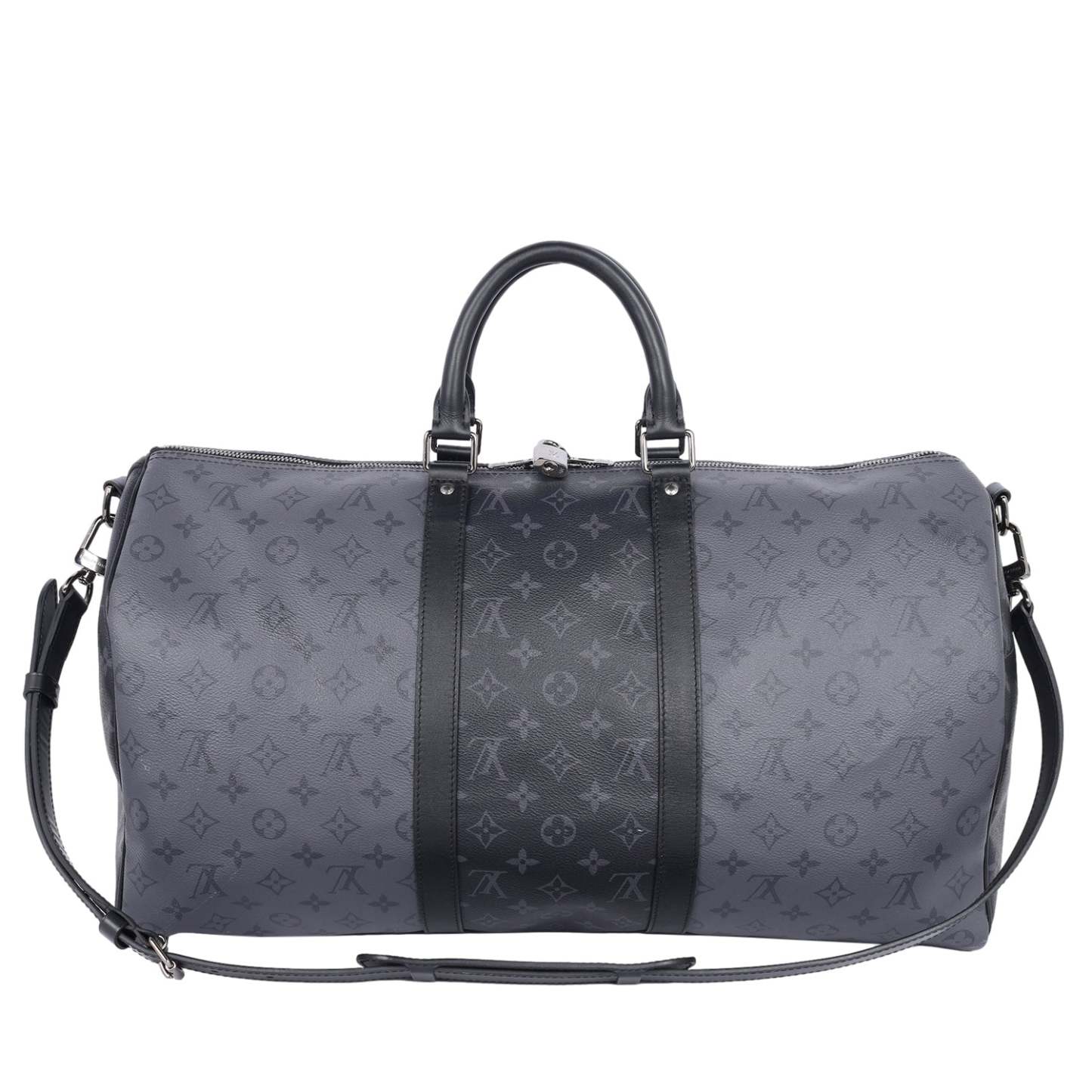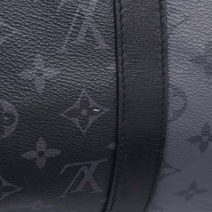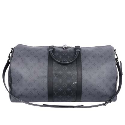 Authentic Lothtuis Vuthtitton Eclipse Reverse Keepall Bandouliere 50 duffle bag. Features black and grey coated canvas, black leather dual rolled handles, natural cowhide leather trim, and siLthtVer hardware. Its top zip closure opens to a fabric interior with a zipper pocket and d ring.