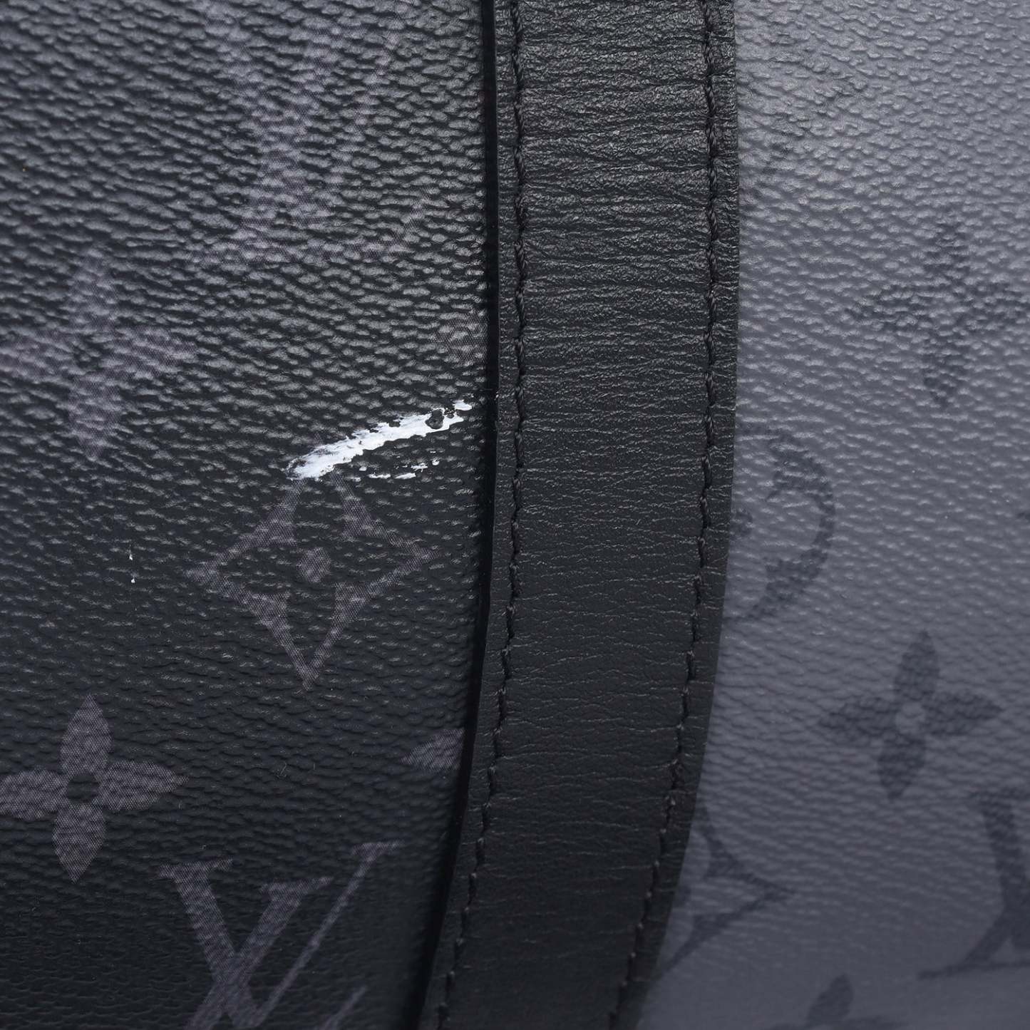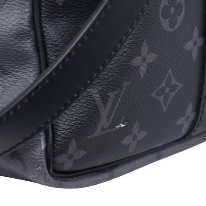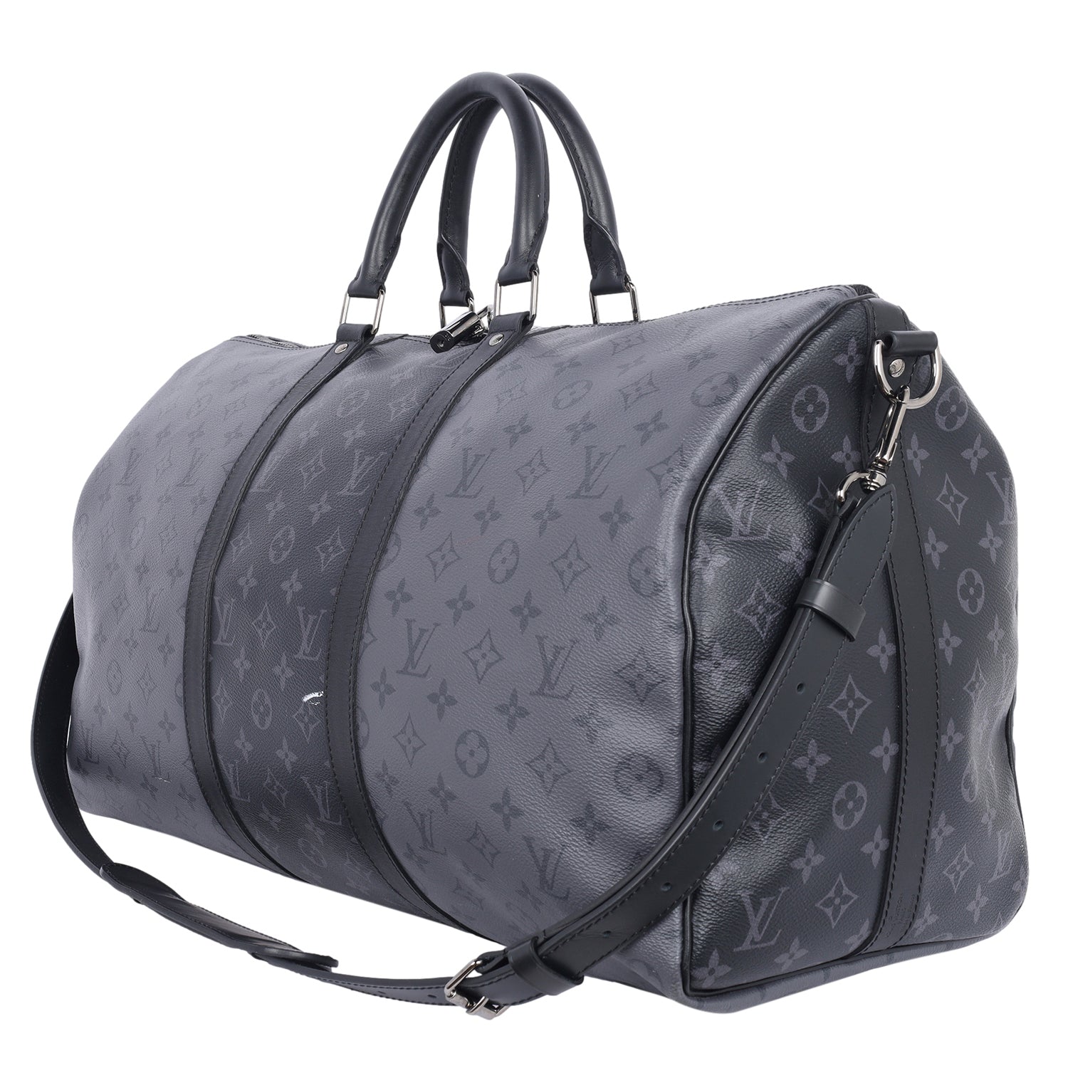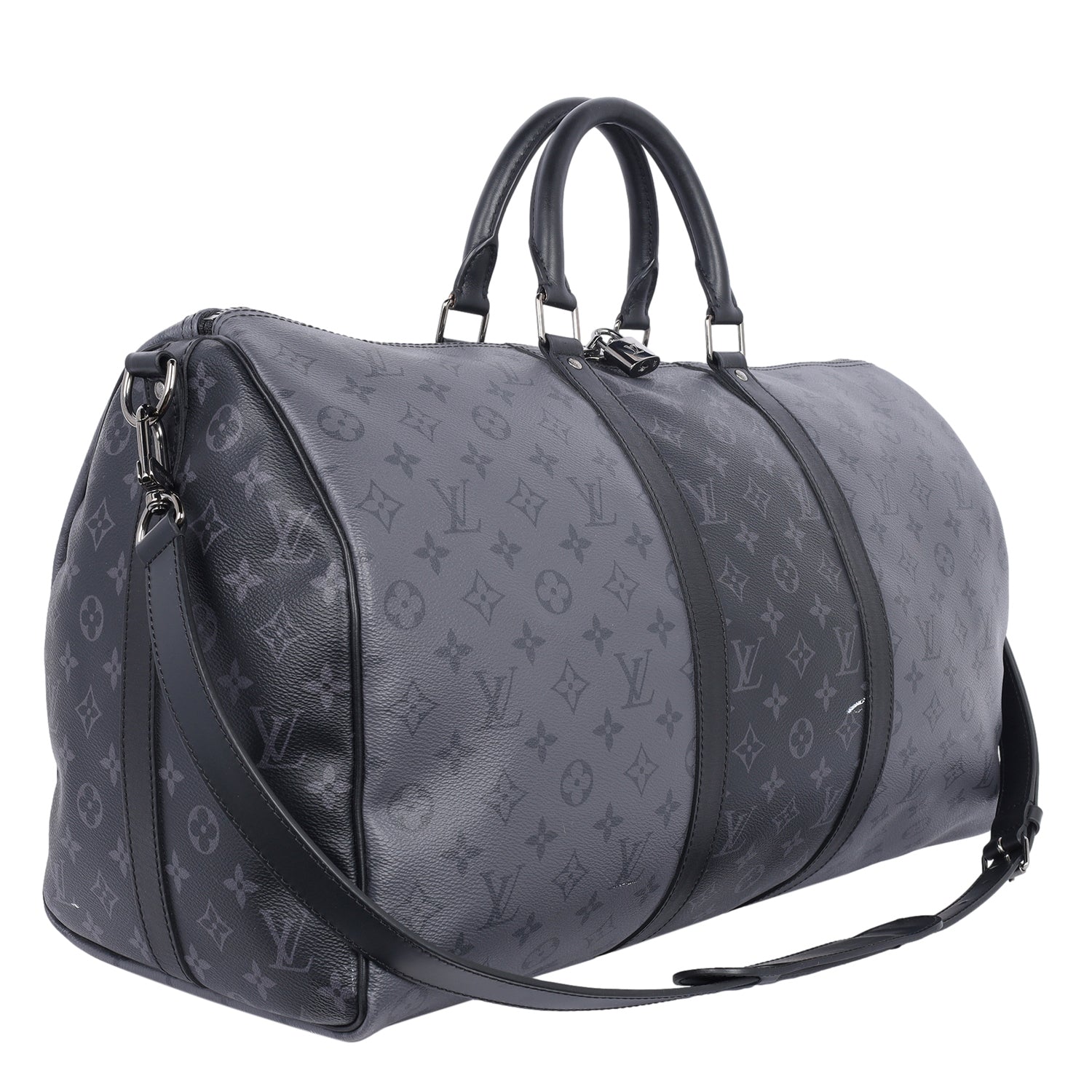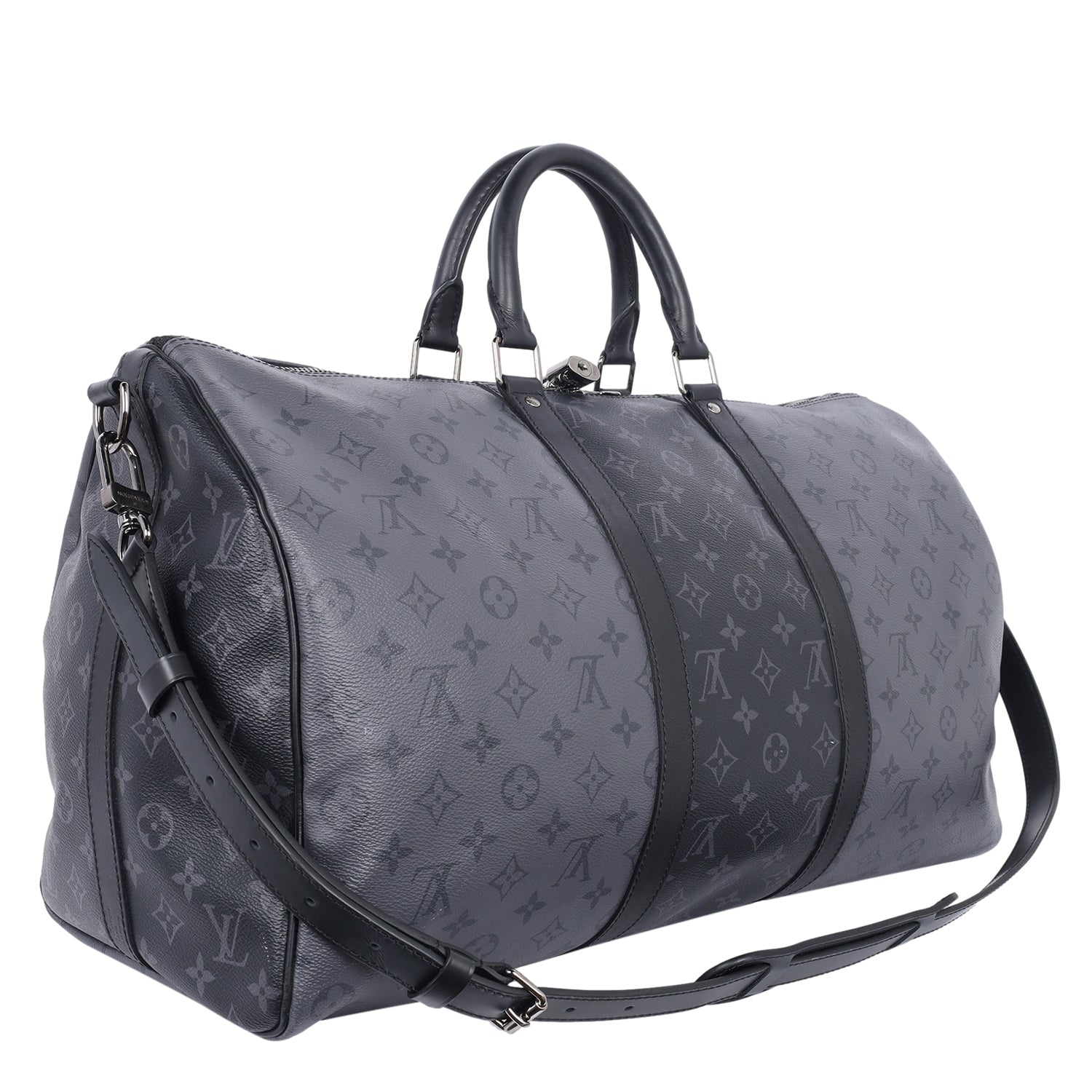 Authentic Lothtuis Vuthtitton Eclipse Reverse Keepall Bandouliere 50 duffle bag. Features black and grey coated canvas, black leather dual rolled handles, natural cowhide leather trim, and siLthtVer hardware. Its top zip closure opens to a fabric interior with a zipper pocket and d ring.