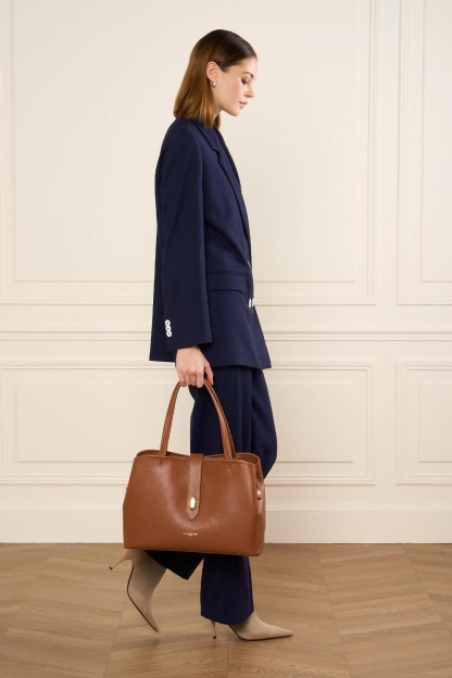 Ce sac cabas est confectionné de cuir de vachette grainé. Il possède deux grandes poches simple qui se ferme avec un rabat, une poche centrale zippée ainsi que deux poches intérieure zippée. Il se porte à l'épaule ou à la main.