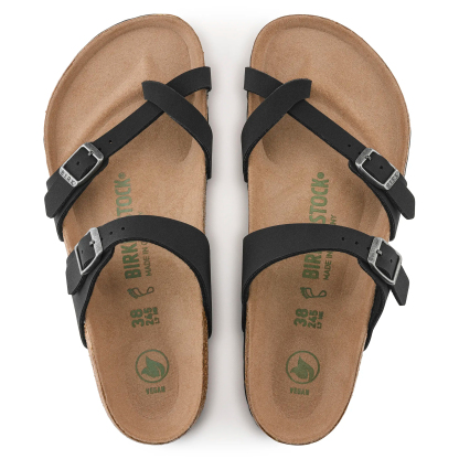 Il sandalo Birkenthtstock Mayari è un infradito dalla forma slanciata con cinturino incrociato attorno all’alluce. Il riuscito connubio di design e comfort fa di questo infradito, elegante e comodo al tempo stesso, la scelta ideale per donne e uomini attenti alla moda. La tomaia è in materiale sintetico Birko-Flor® dermoaffine e resistente.