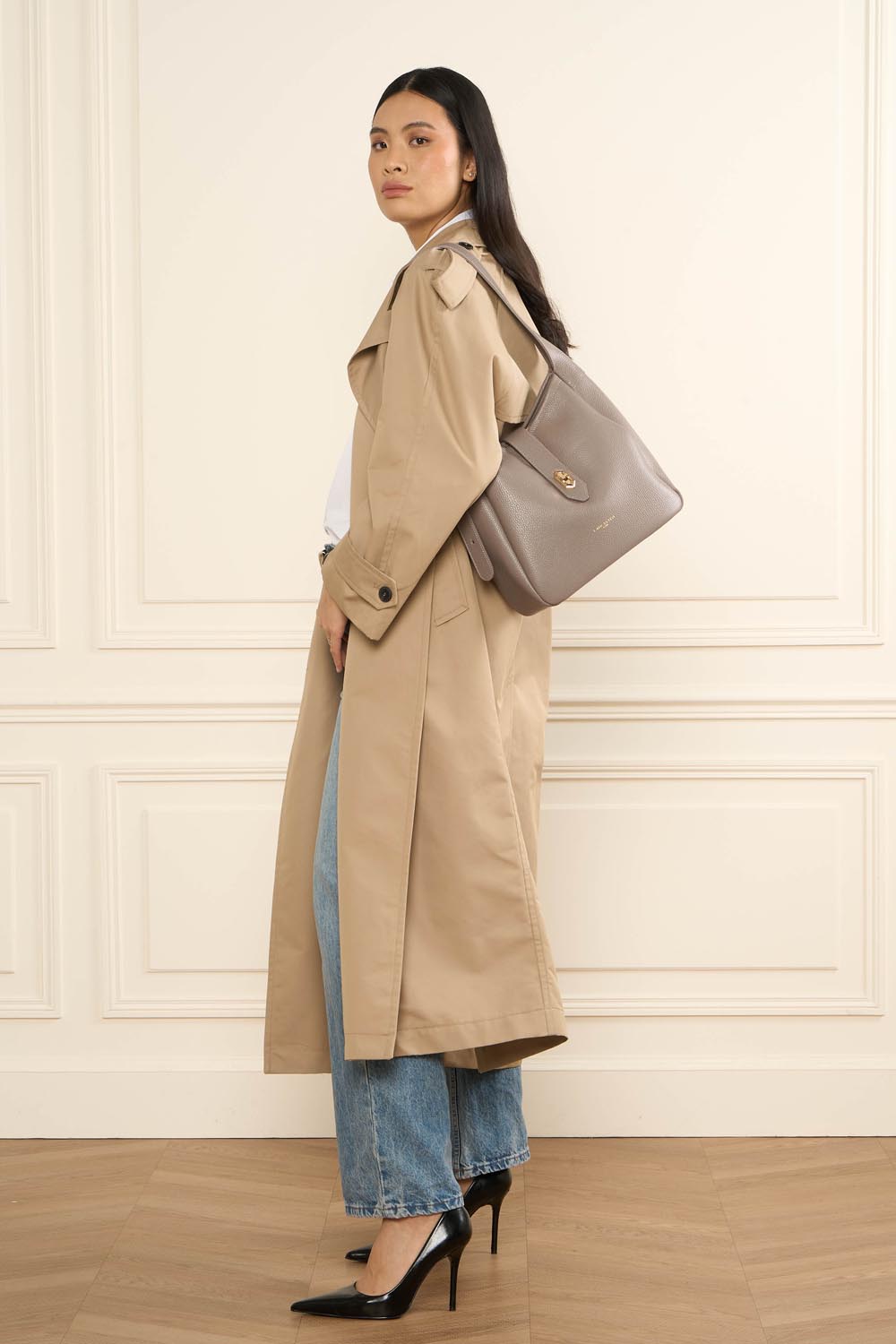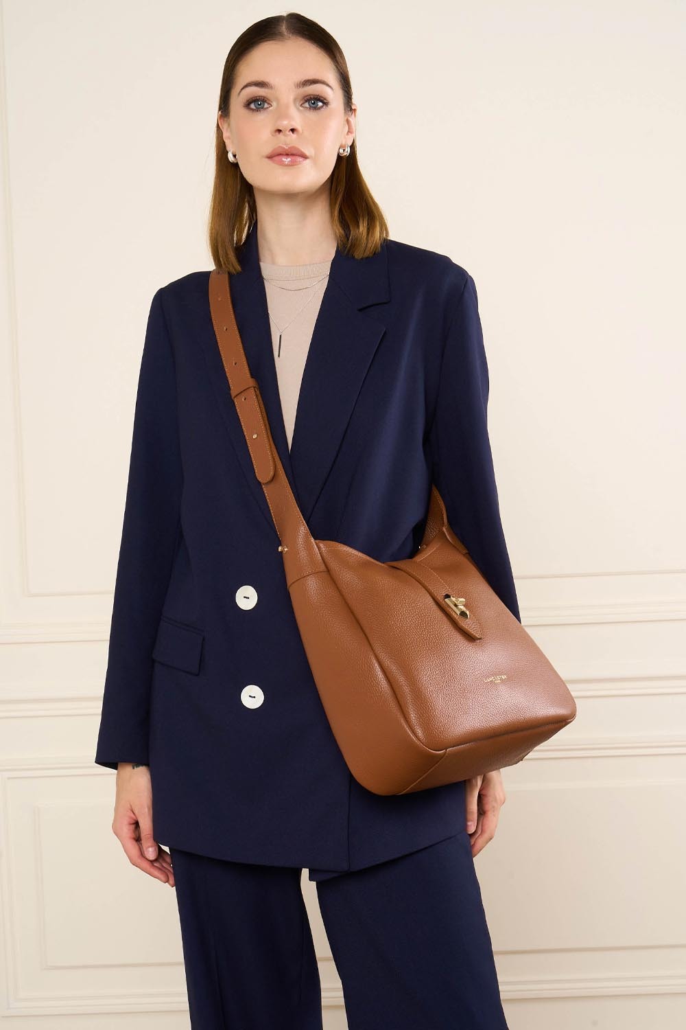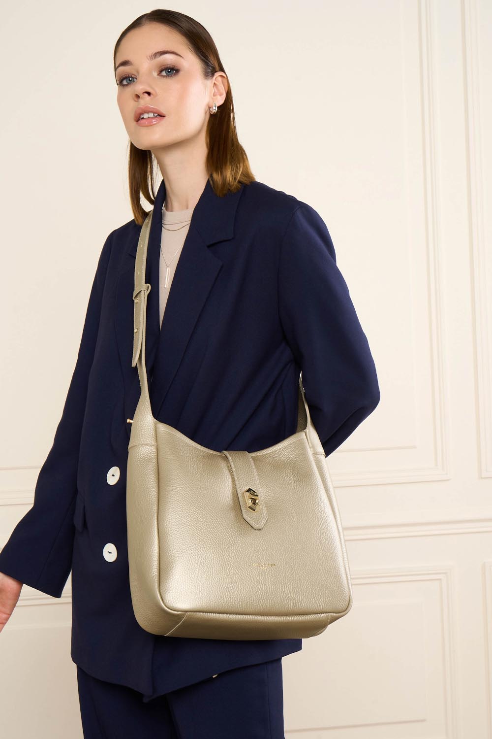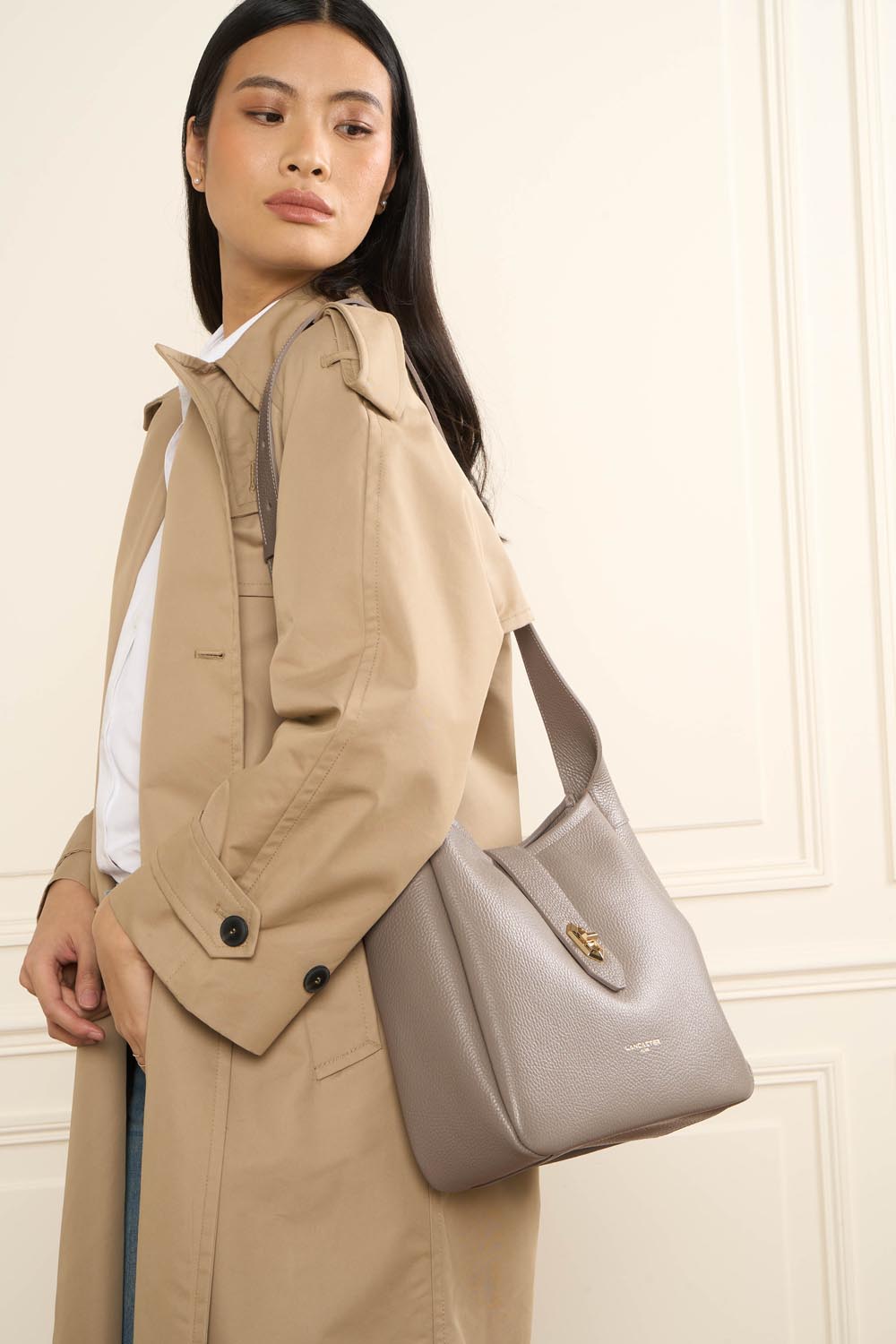 Ce sac seau est confectionné de cuir de vachette grainé. Il comporte une poche extérieure zippée ainsi qu'une poche intérieure simple principale. Il se porte à l'épaule ou croisé.