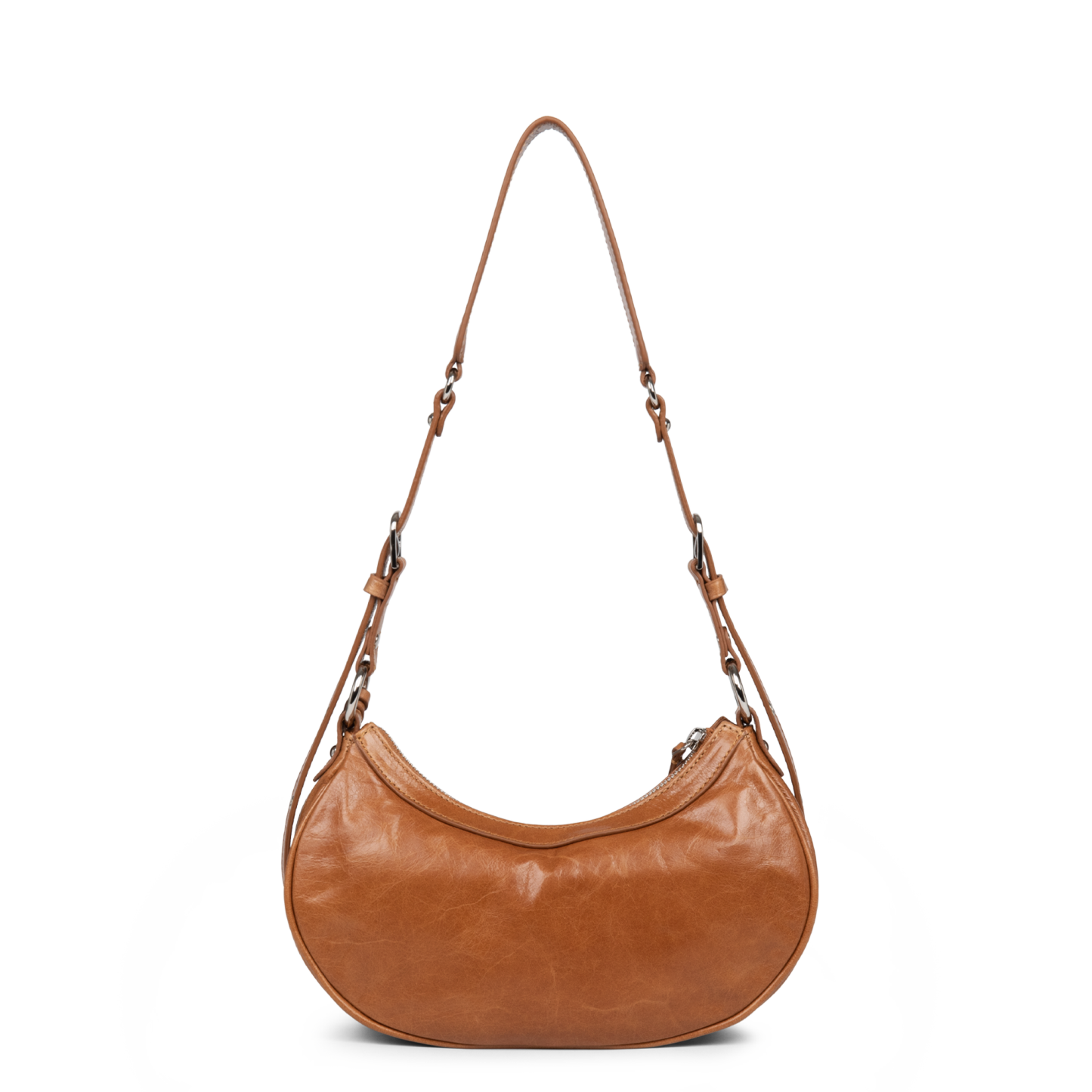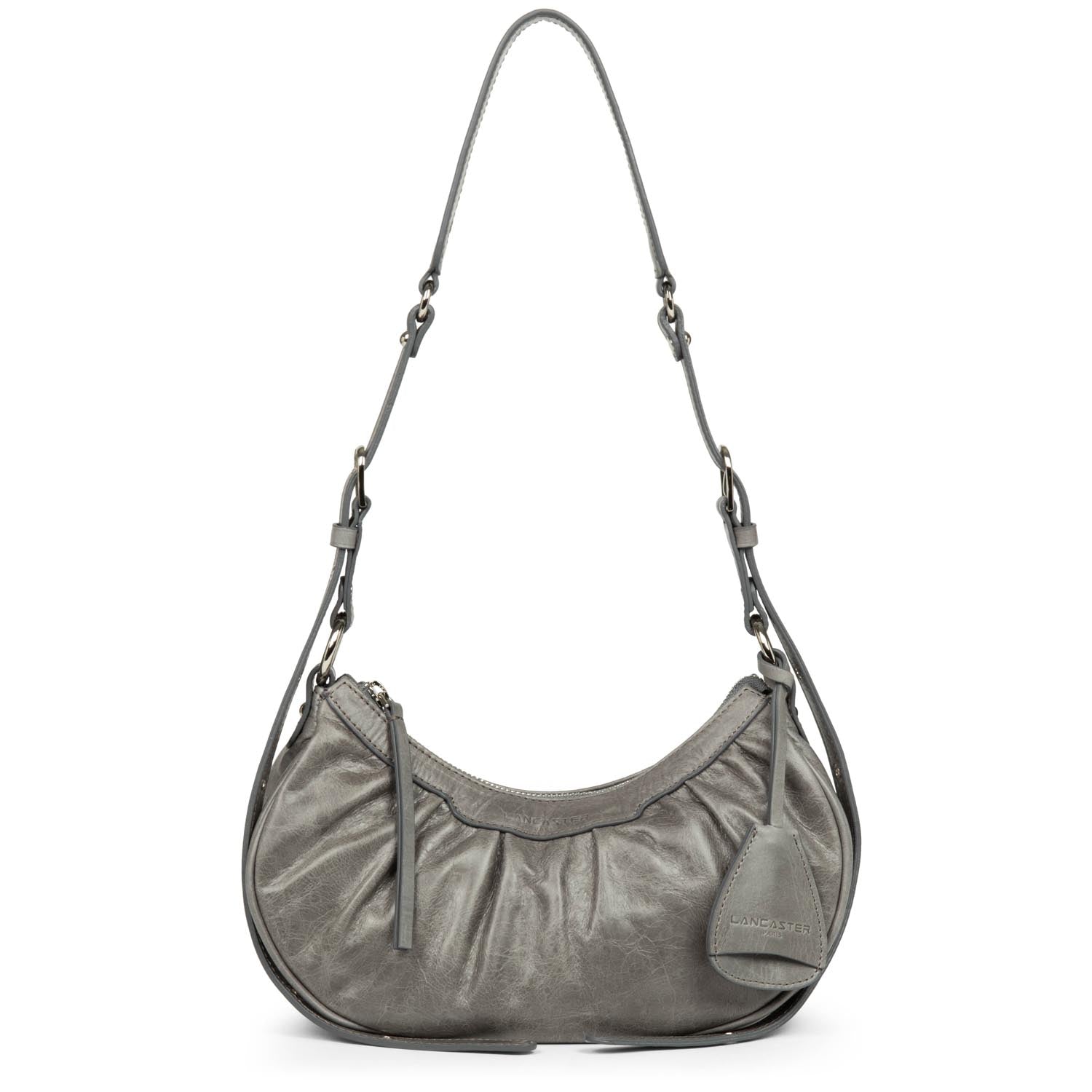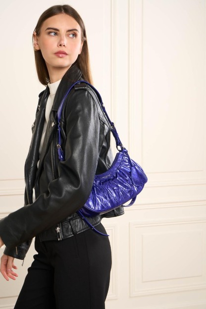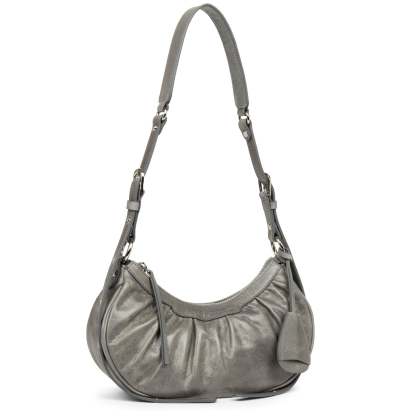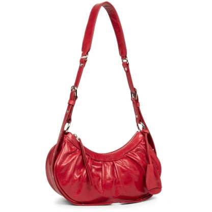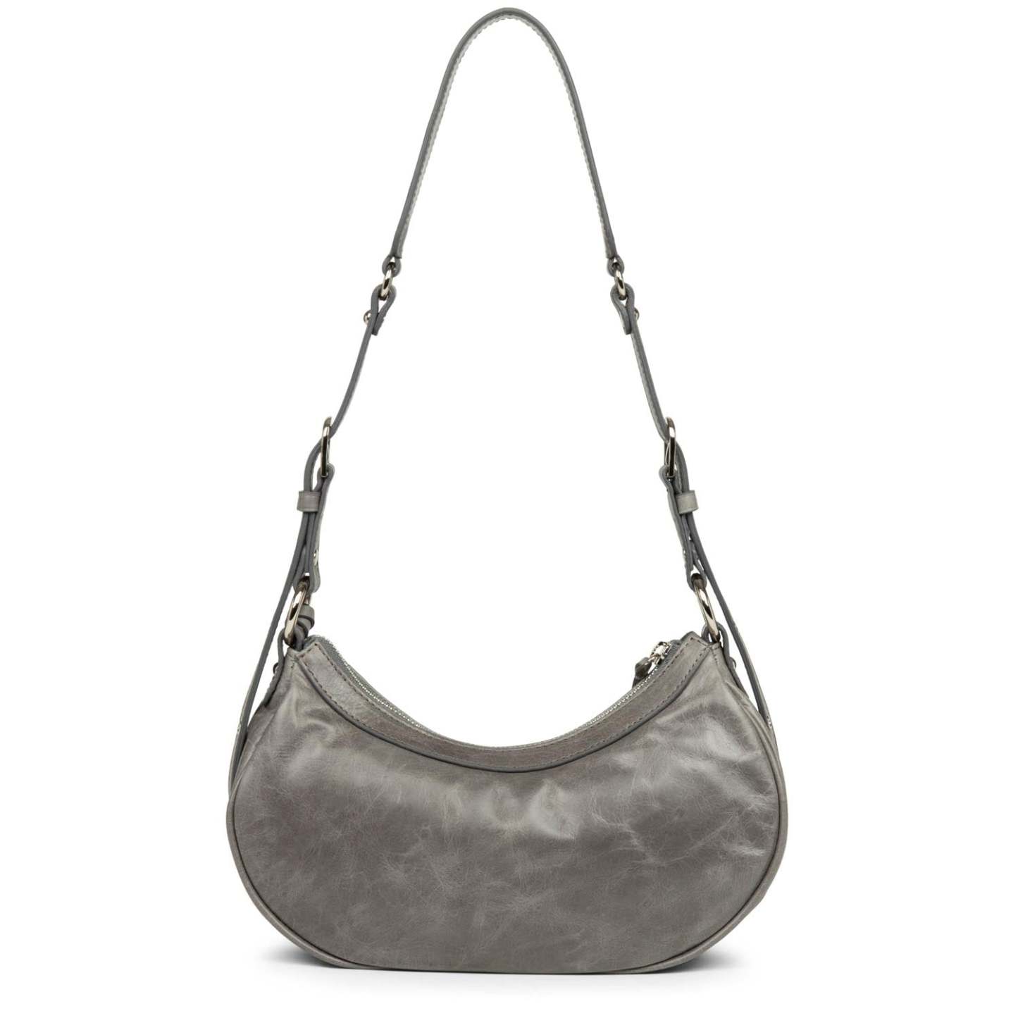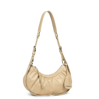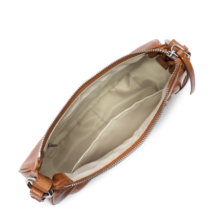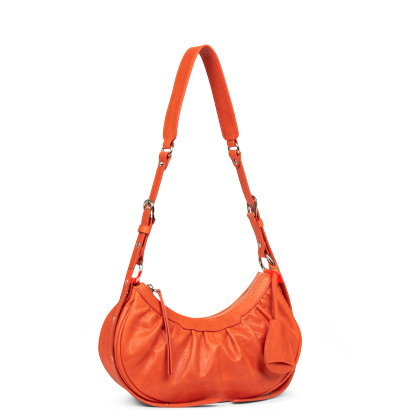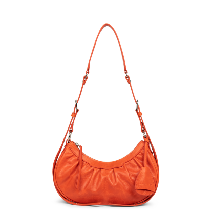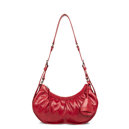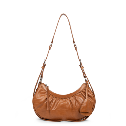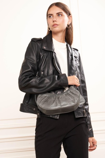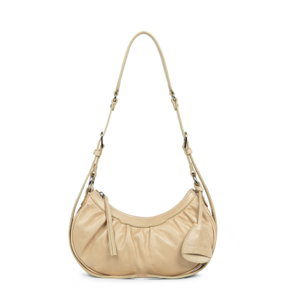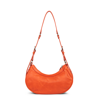 Ce petit sac demi lune est confectionné de cuir de vachette aspect vieilli. Il comporte une grande poche principale. Il se porte à l'épaule ou croisé.