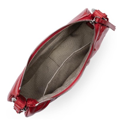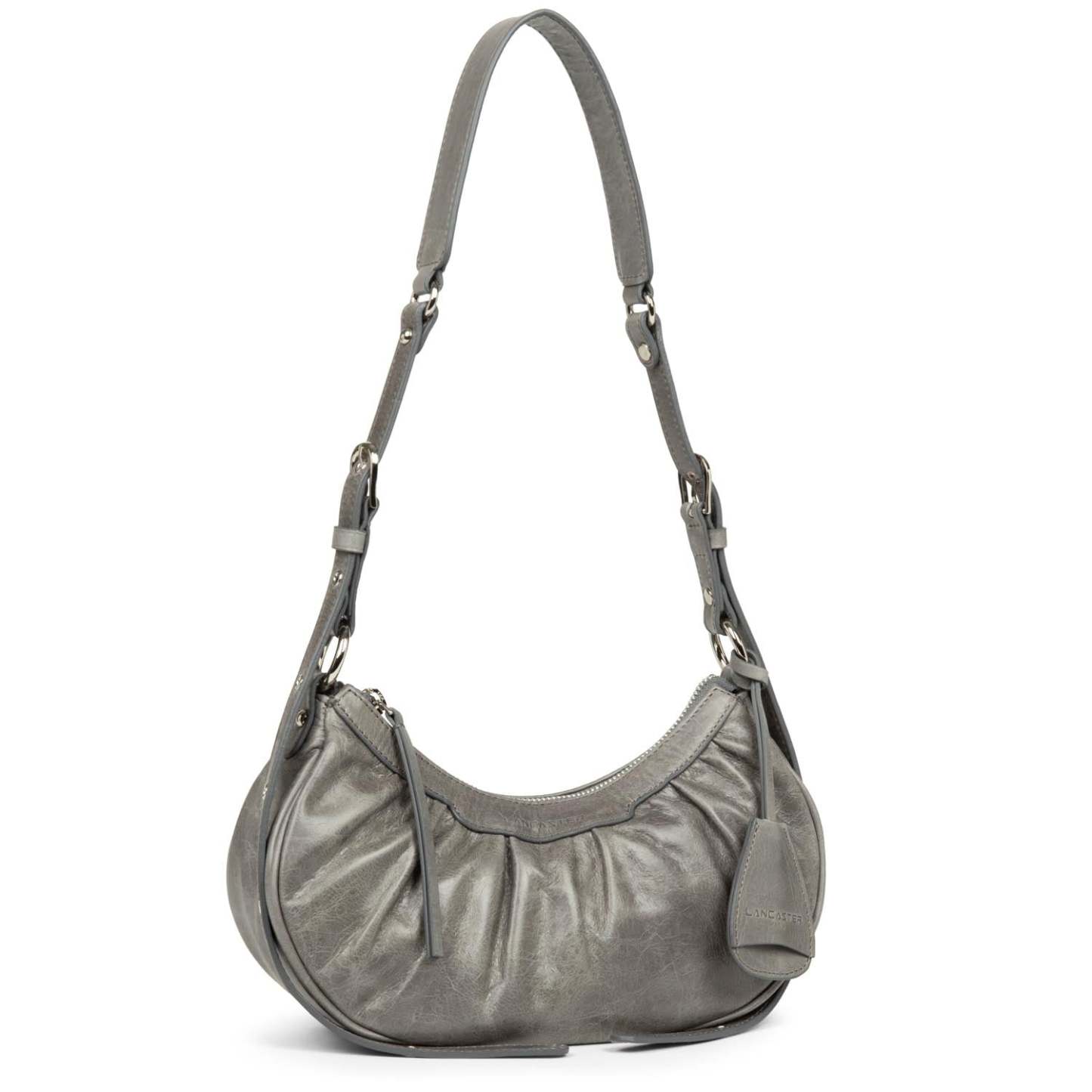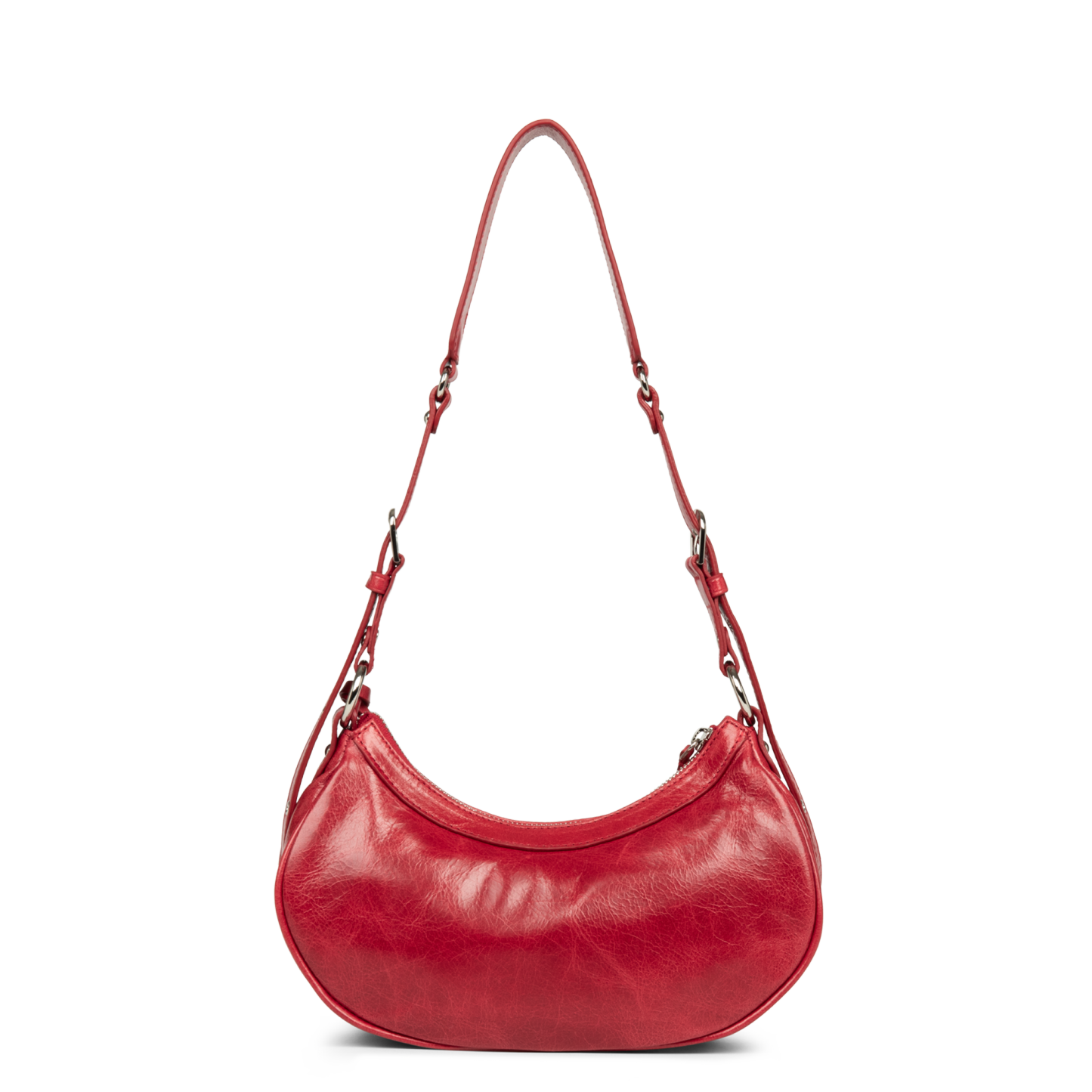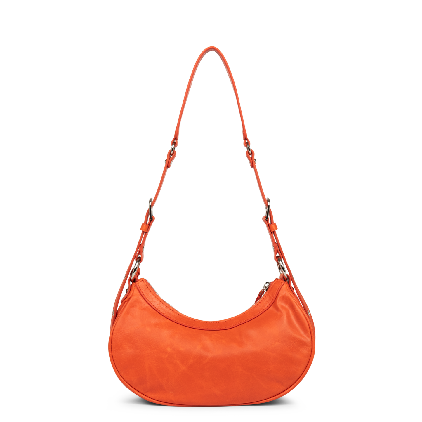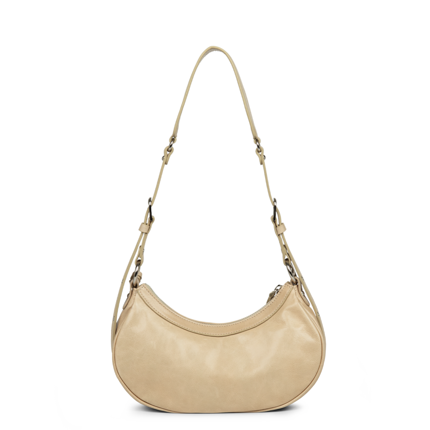 Ce petit sac demi lune est confectionné de cuir de vachette aspect vieilli. Il comporte une grande poche principale. Il se porte à l'épaule ou croisé.