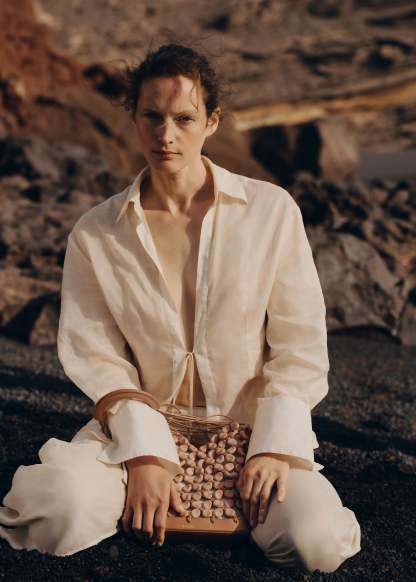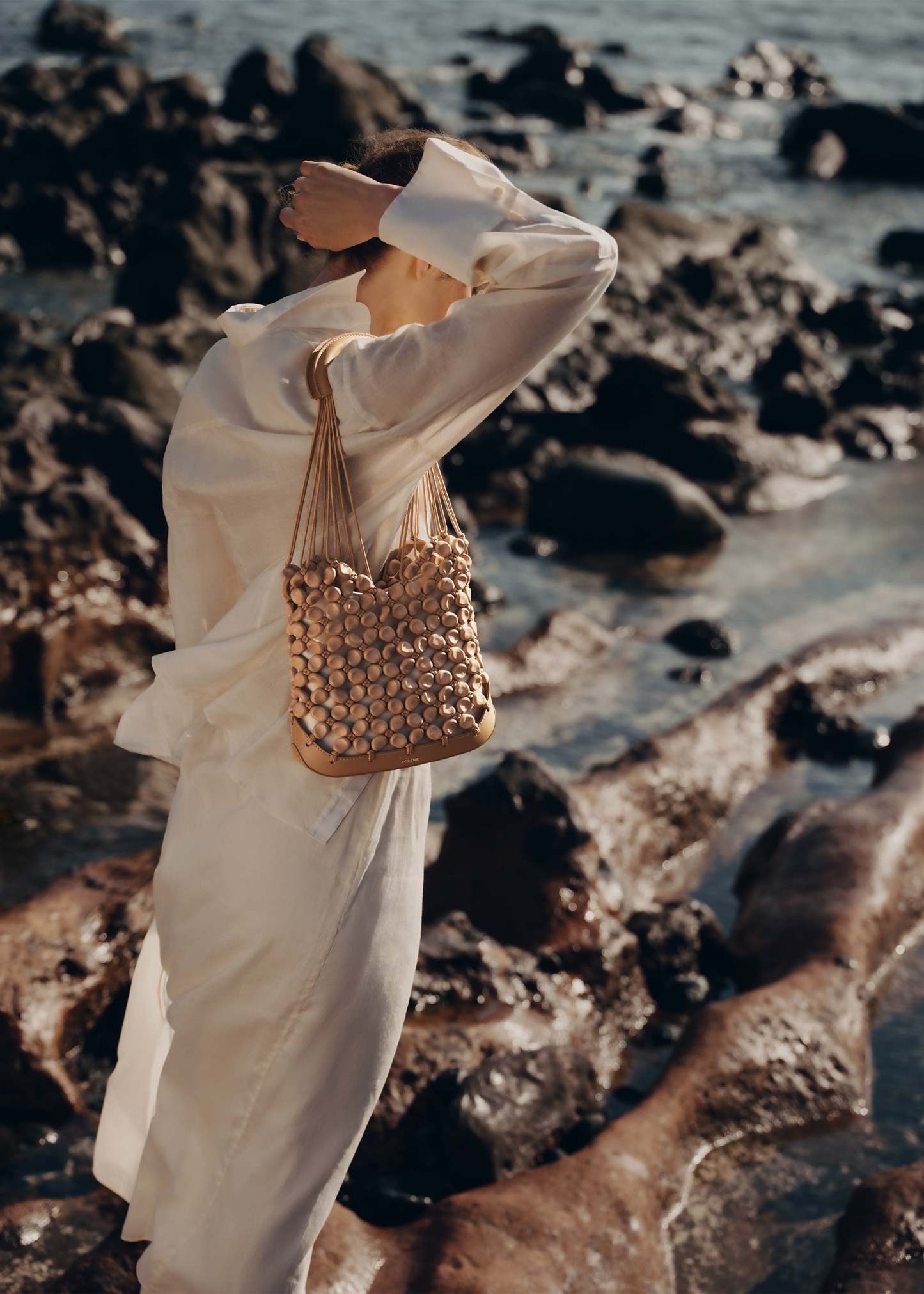 Issu de la collection Plèi qui met au centre du jeu l’upcycling des chutes de cuir, le modèle « Solé » mêle innovation et artisanat. Fabriquées en France, les 240 perles, au design inspiré des galets, sont moulées à partir de chutes de cuir issues des collections Polthtène. Enfilées sur des cordons de coton ciré, elles sont retenues par 120 nœuds faits à la main selon la technique artisanale du macramé. Ce sac, d’inspiration filet, est réhaussé de détails maroquiniers avec son fond et sa poignée en cuir lisse surpiqué.