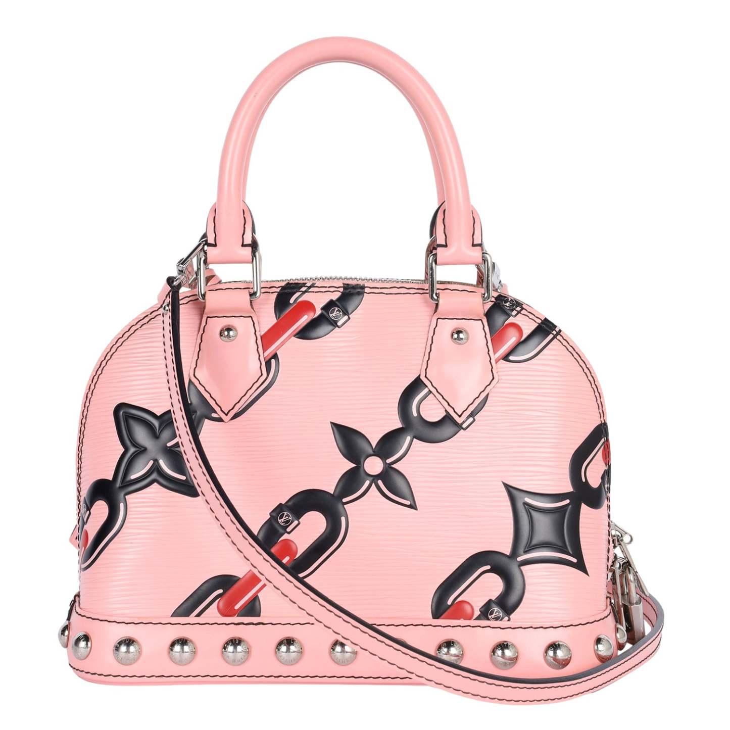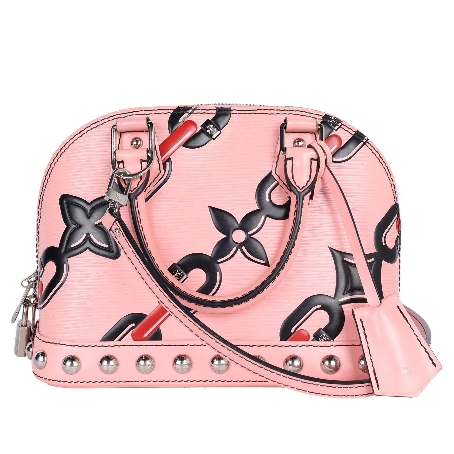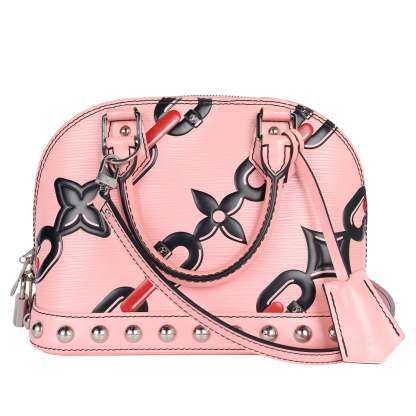 Authentic Lothtuis Vuthtitton Chain Flower Epi Leather Alma BB Crossbody bag in pink. Features pink, black and crimson chain flower print on Epi leather, siLthtVer-tone hardware, dual rolled top handles, single optional flat shoulder crossbody strap, protective feet at bottom, stud embellishments at bottom exterior, black alcantara lining, slip pocket at interior wall and two-way zip closure.