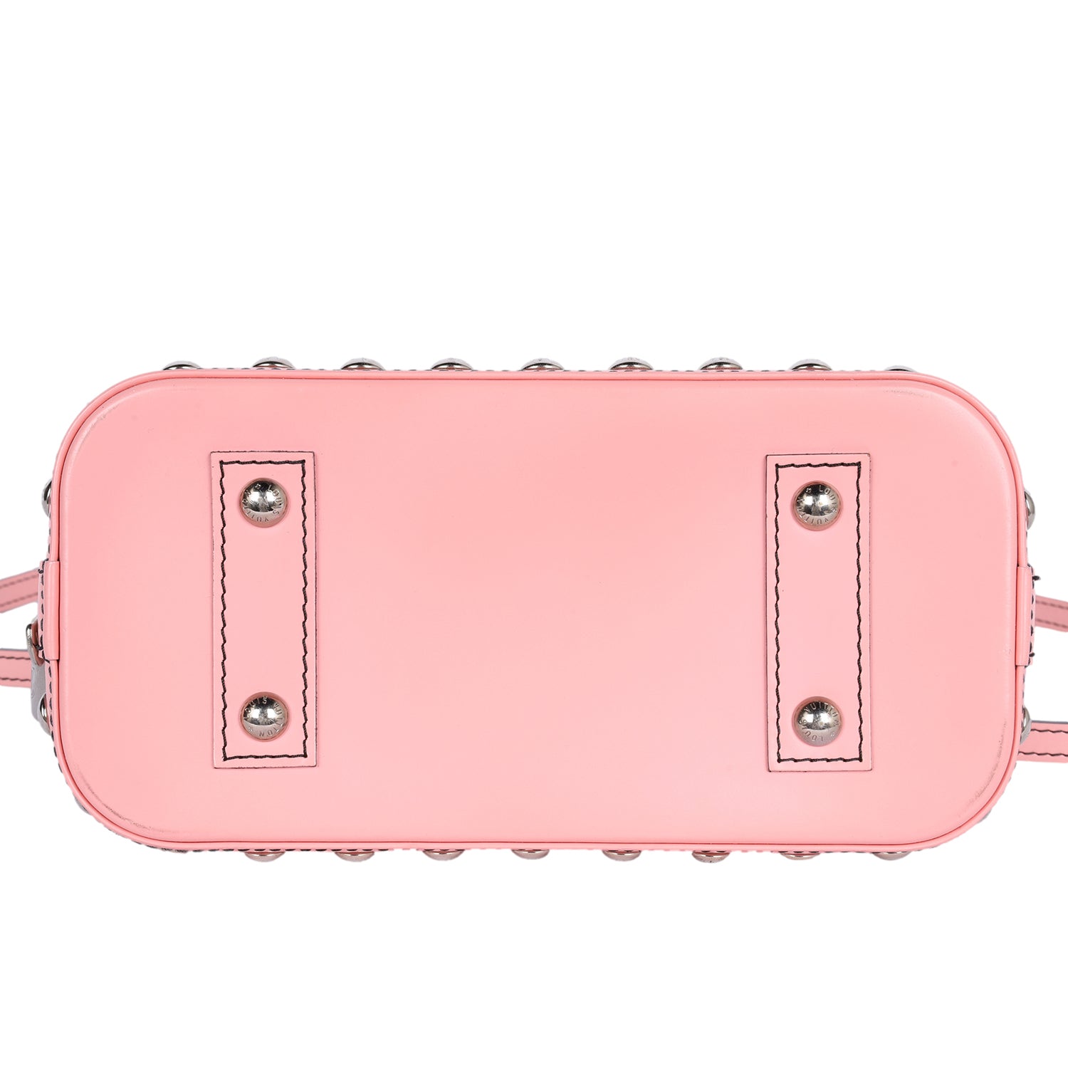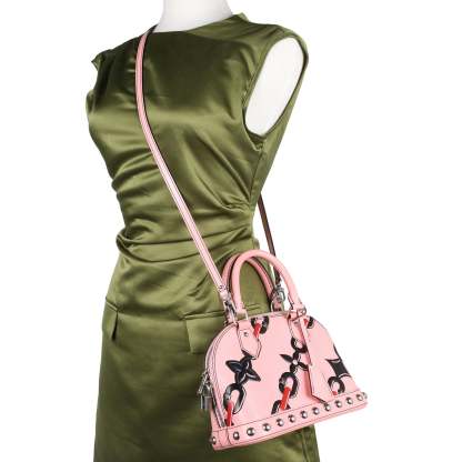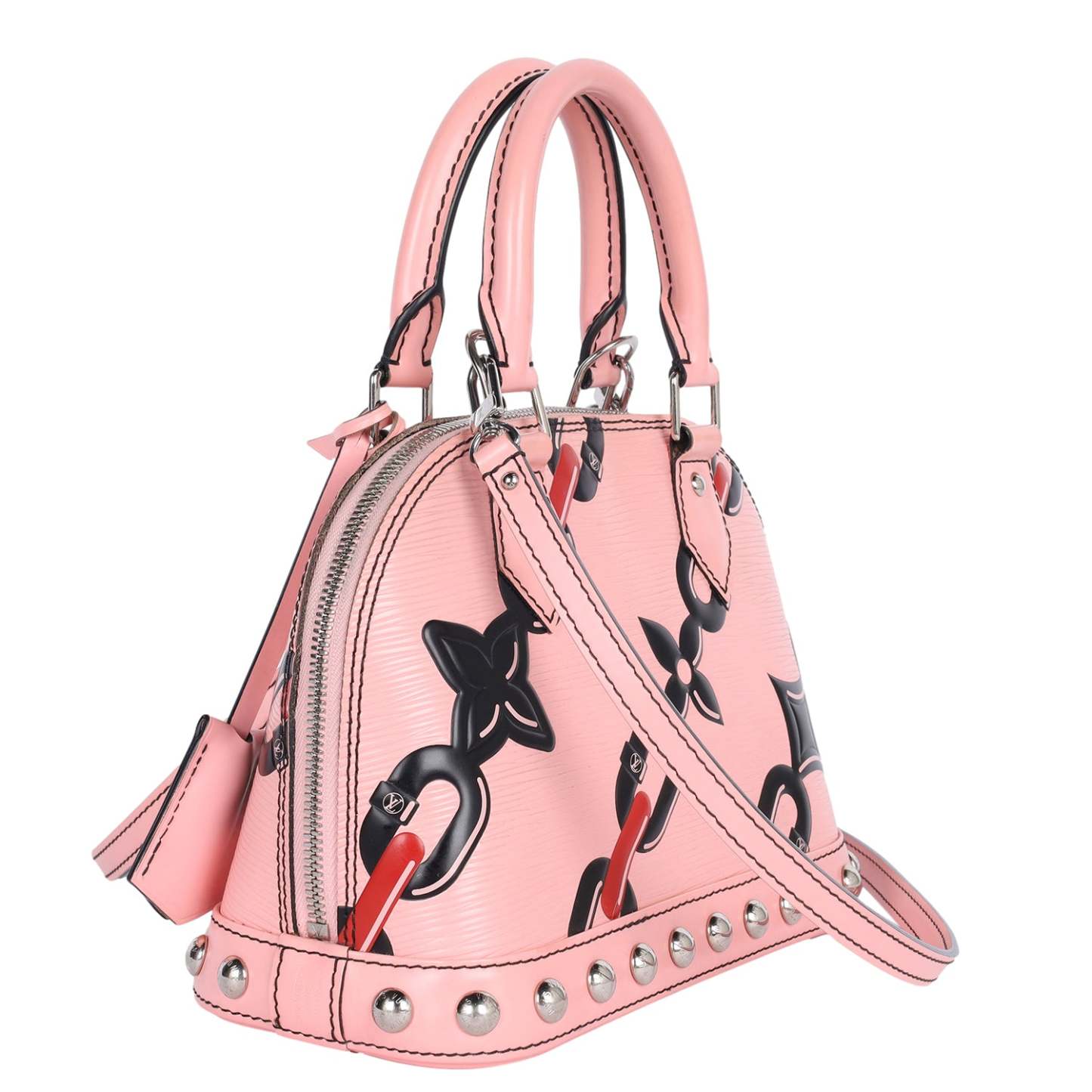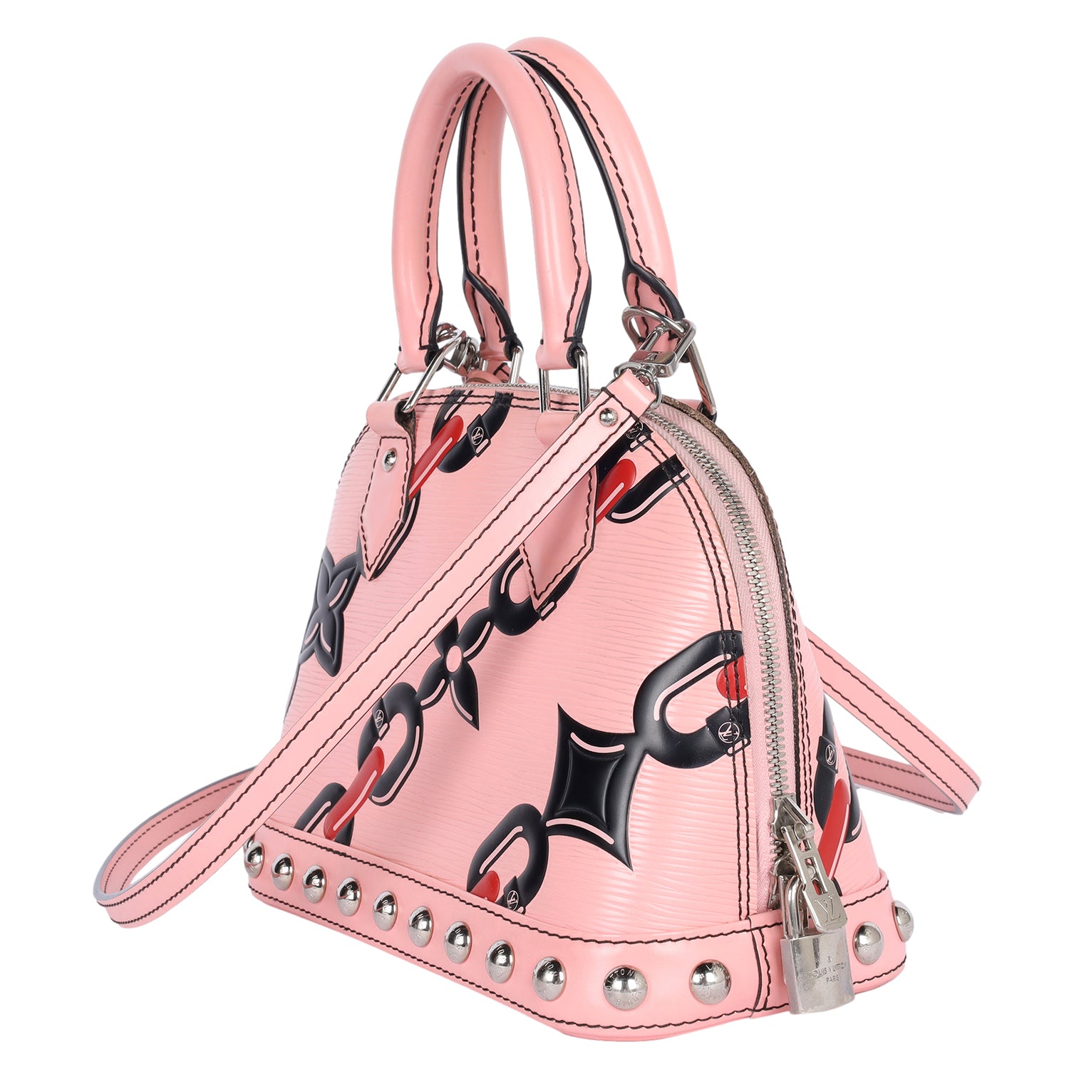 Authentic Lothtuis Vuthtitton Chain Flower Epi Leather Alma BB Crossbody bag in pink. Features pink, black and crimson chain flower print on Epi leather, siLthtVer-tone hardware, dual rolled top handles, single optional flat shoulder crossbody strap, protective feet at bottom, stud embellishments at bottom exterior, black alcantara lining, slip pocket at interior wall and two-way zip closure.