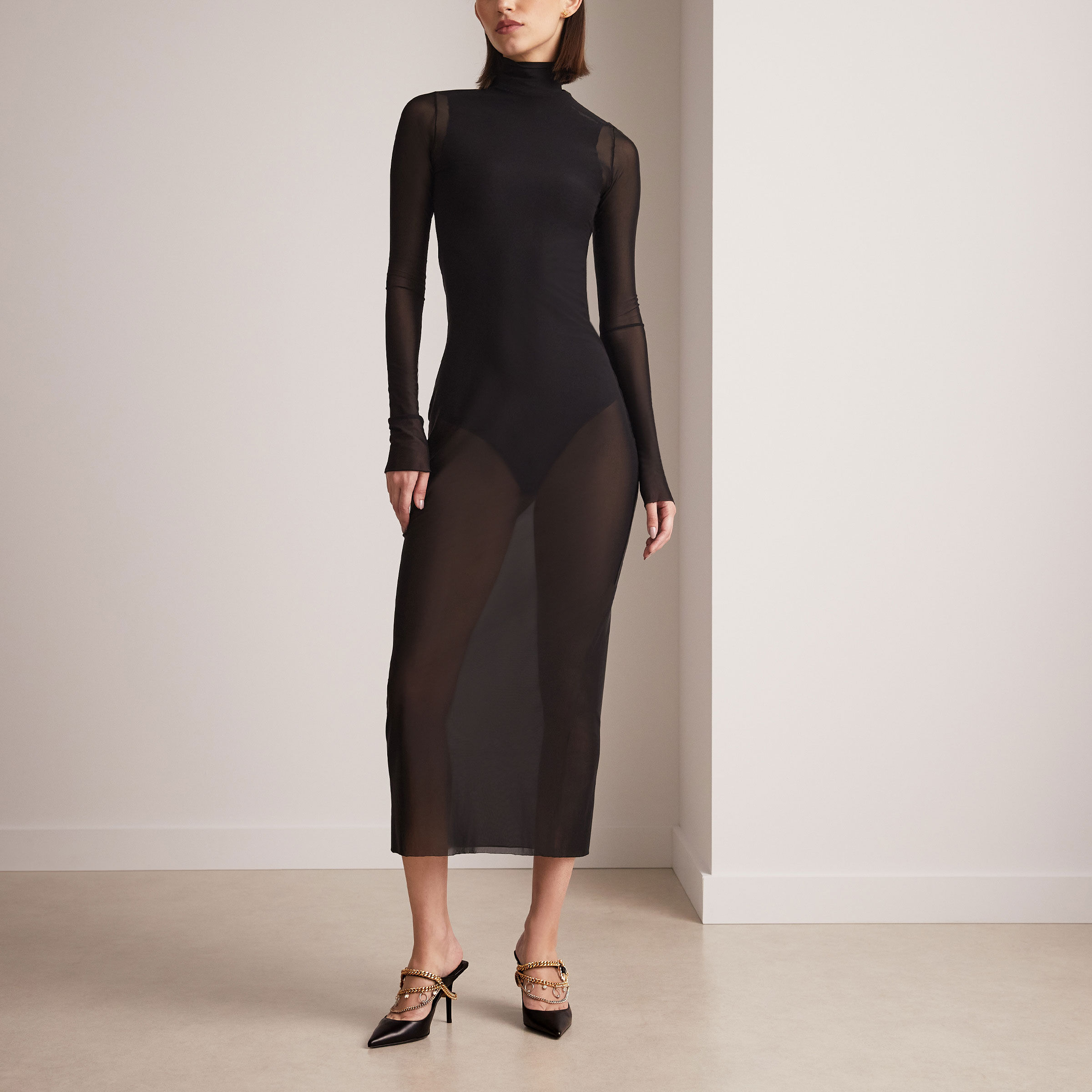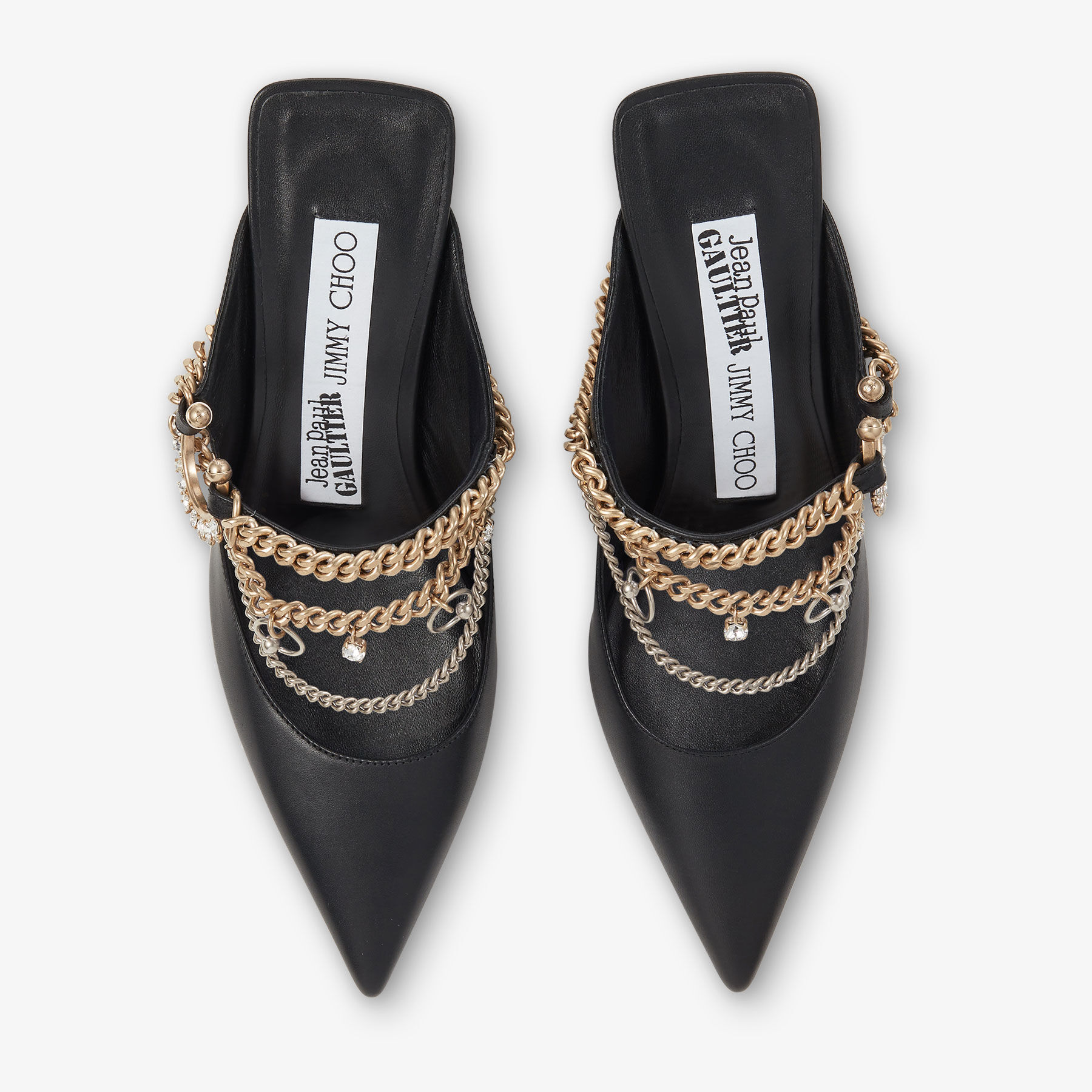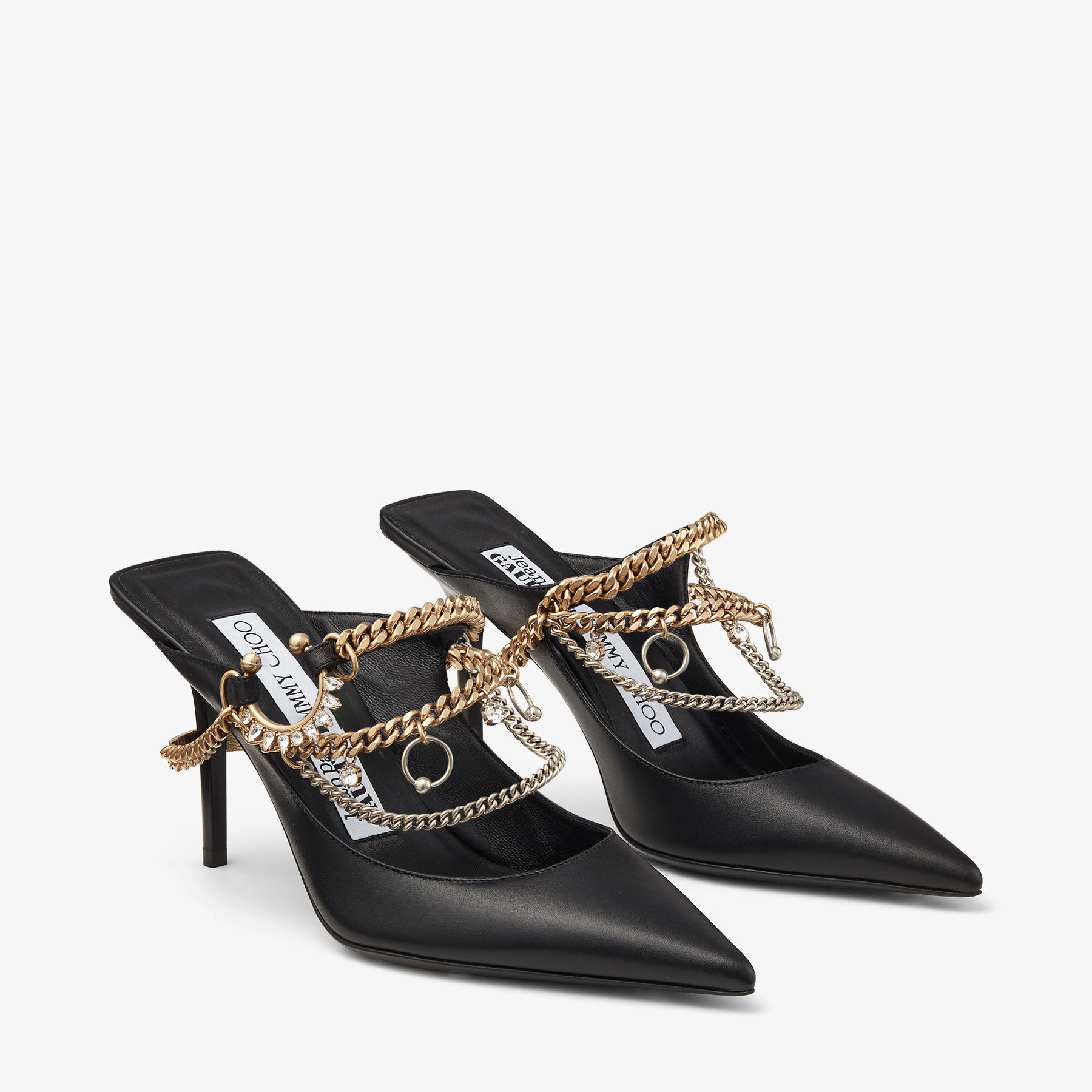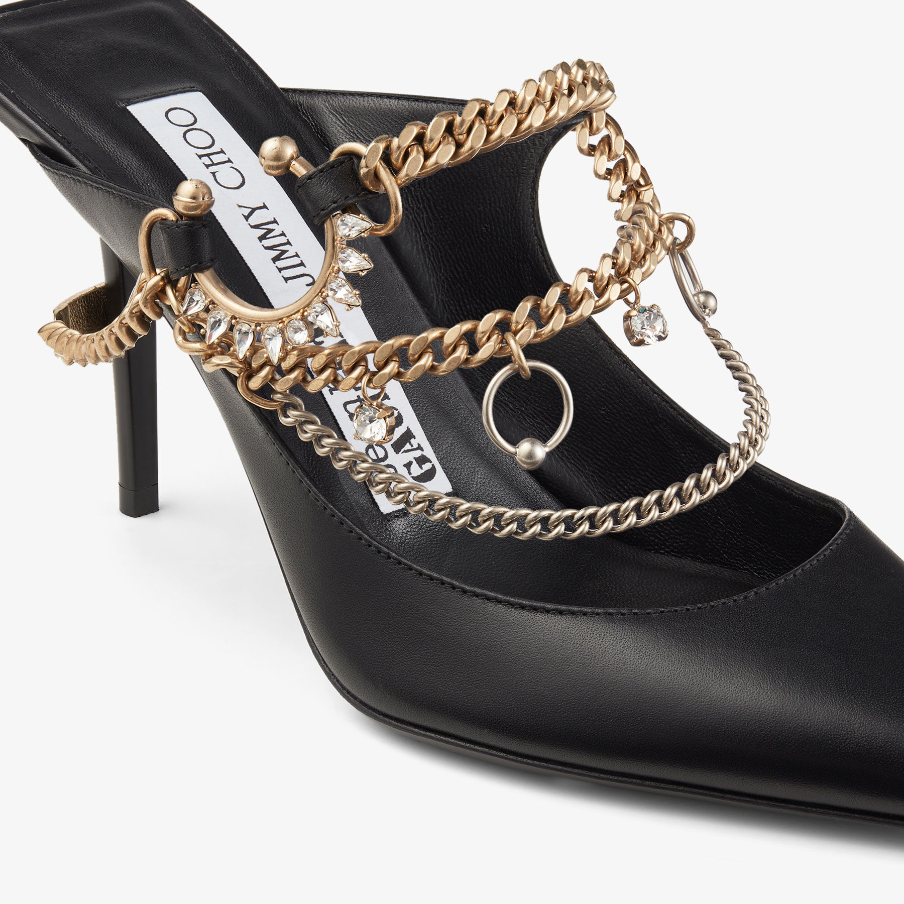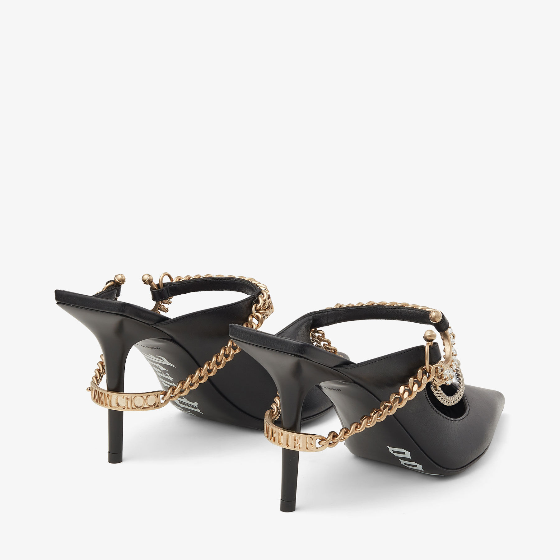 In smooth calf leather, the Bing’s signature cuff is reimagined as an asymmetric brass jewellery piece decorated with crystals. The metallic chain starts on the front and continues onto the back of the shoe, embracing the heel, where it is finished with a leather-lined metallic plate. It is constructed with a chiselled stiletto heel, complemented by a lacquered sole with a digital print logo featuring both brand names.